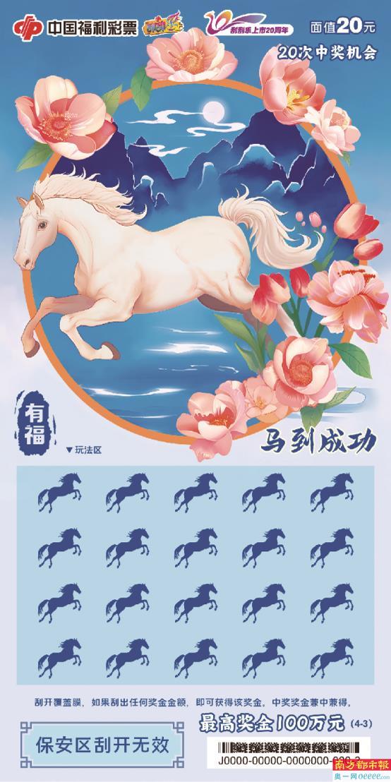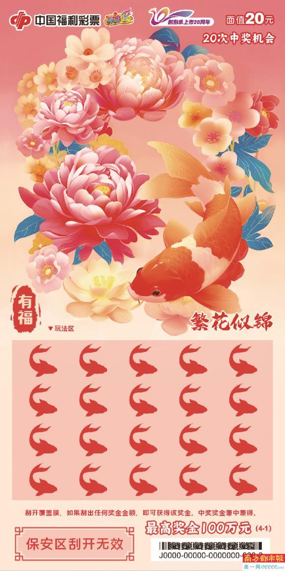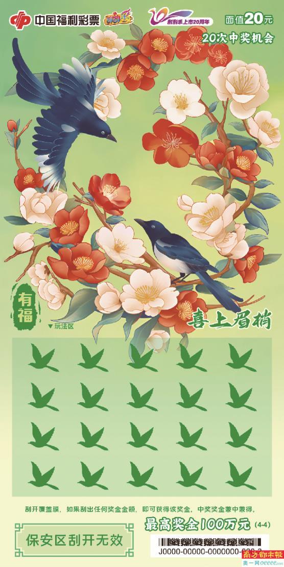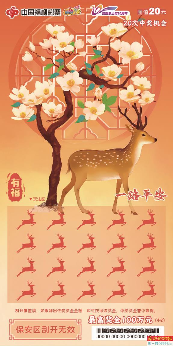 据了解,刮刮乐新游戏“有福”面值20元,一套4枚,分别是“繁花似锦”“一路平安”“马到成功”“喜上眉梢”,选取锦鲤、梅花鹿、骏马和喜鹊为创作元素,搭配牡丹、梅花等吉祥花卉,别具特色的“国潮”风格,洋溢着浓郁的文化魅力。该款彩票共设置9个奖级,最高奖金为100万元,玩法规则也非常简单:刮开覆盖膜,如果刮出任何奖金金额,即可获得该奖金。中奖奖金兼中兼得。