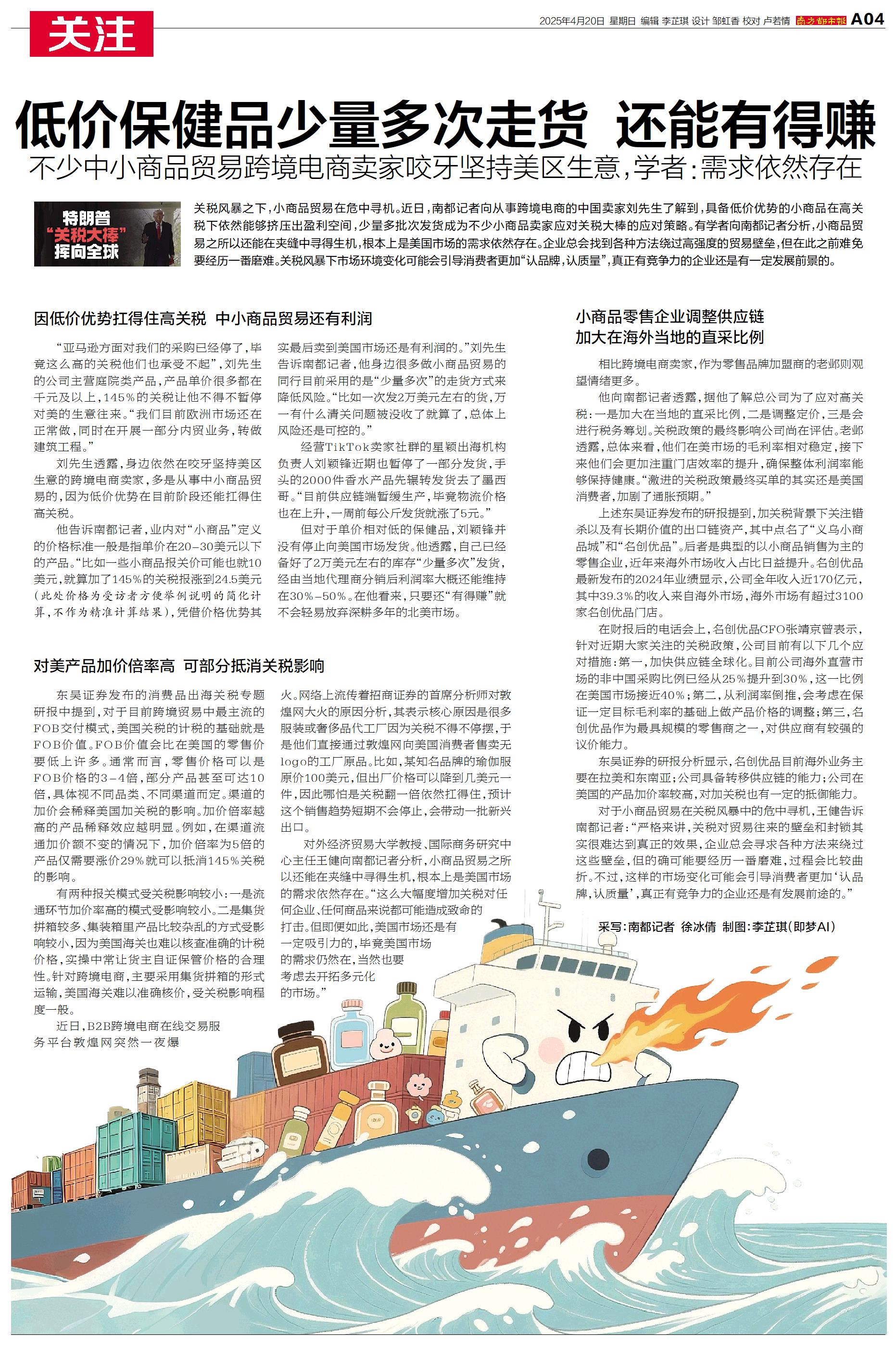 近日,南都记者向从事跨境电商的中国卖家刘先生了解到,具备低价优势的小商品在高关税下依然能够挤压出盈利空间,少量多批次发货成为不少小商品卖家应对关税大棒的应对策略。