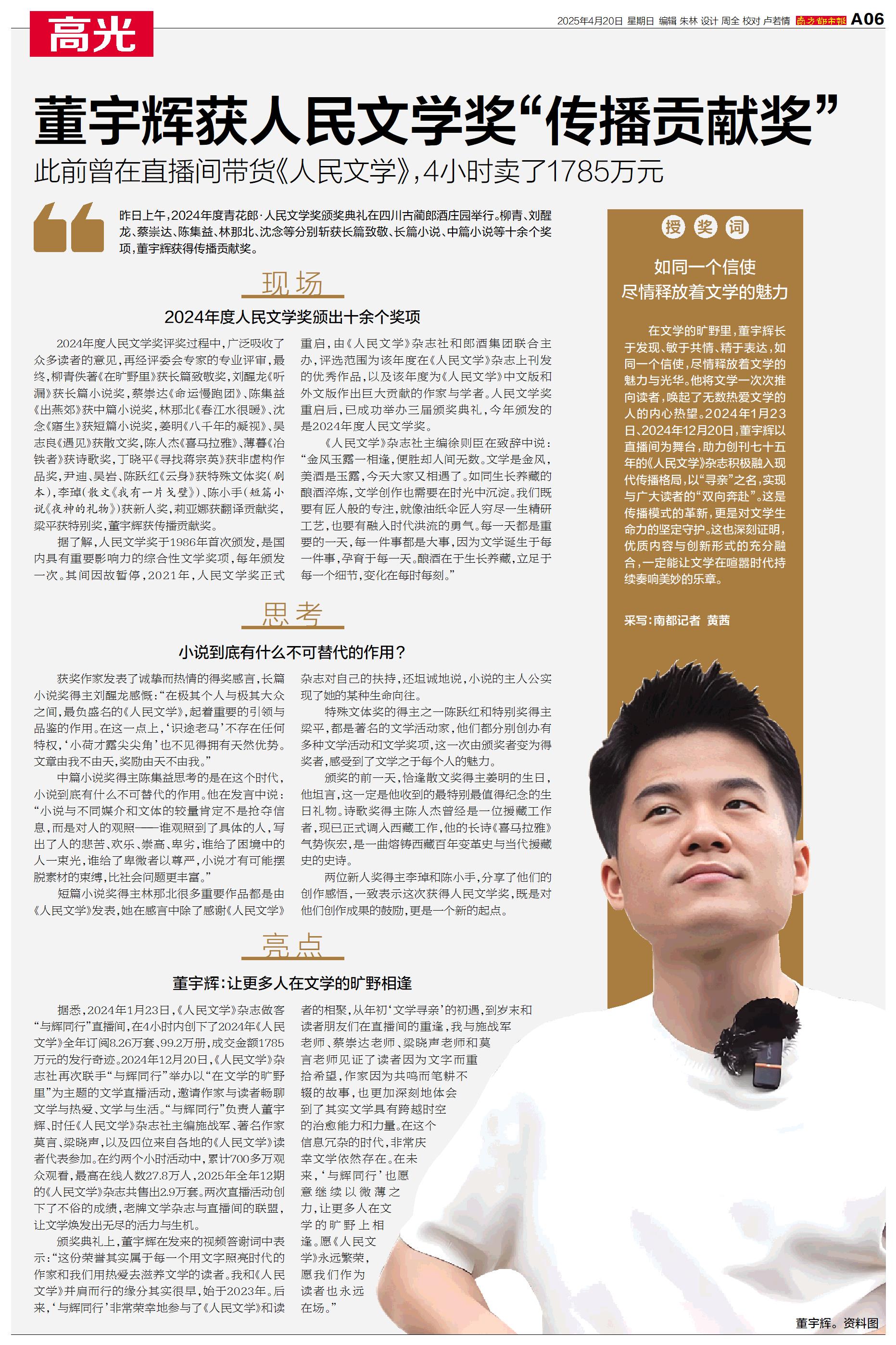 董宇辉获人民文学奖“传播贡献奖”