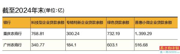 若把广州农商行、重庆农商行放在共同披露的数据口径上对比,截至2024年末,广州农商行科技型企业贷款余额340.8亿,专精特新企业贷款余额184.1亿,分别是重庆农商行的44.3%、61.3%;绿色贷款余额603.1亿,普惠小微企业贷款余额516.7亿,分别是重庆农商行的82.4%、36.9%。