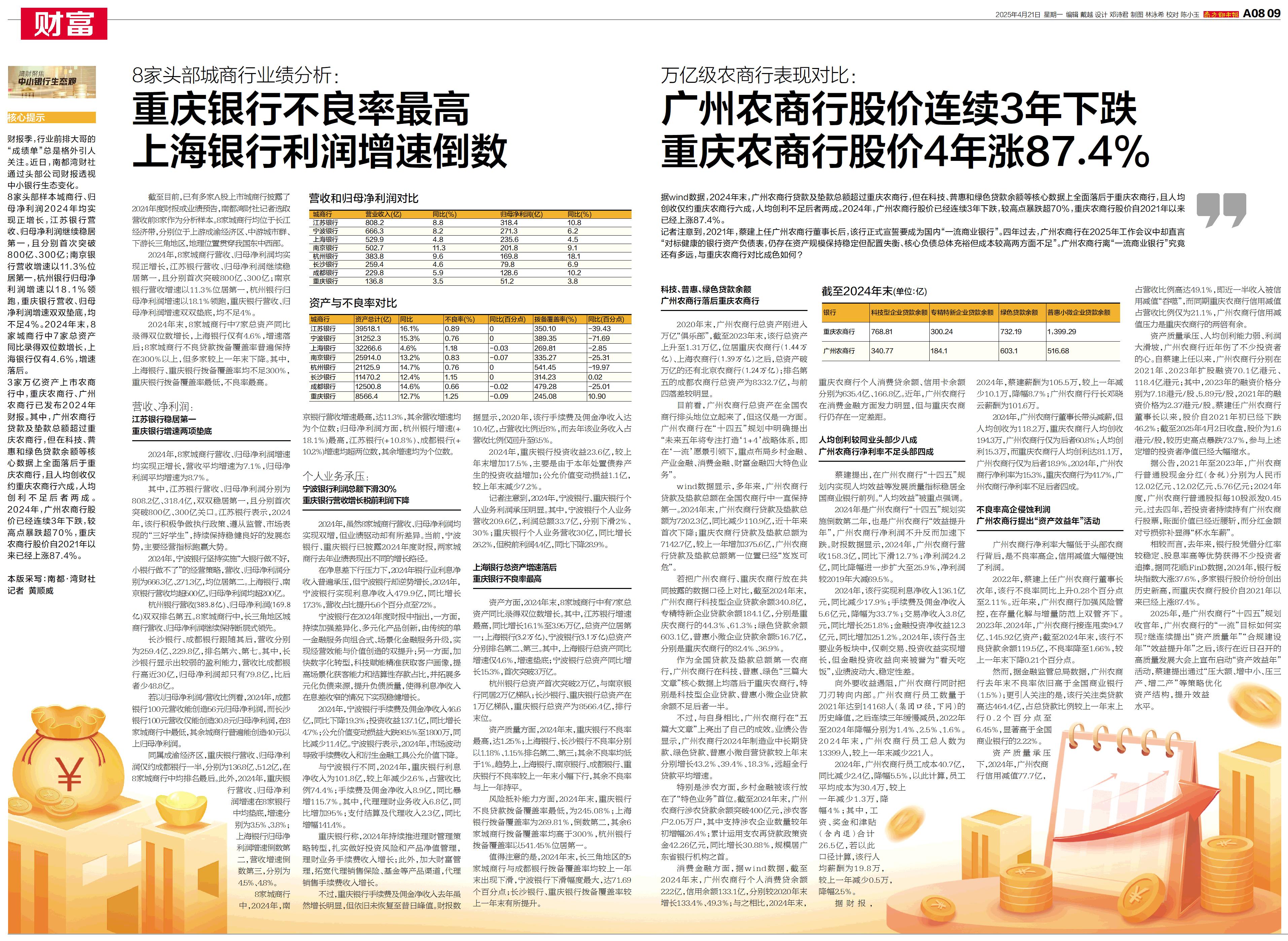 据wind数据,2024年末,广州农商行贷款及垫款总额超过重庆农商行,但在科技、普惠和绿色贷款余额等核心数据上全面落后于重庆农商行,且人均创收仅约重庆农商行六成,人均创利不足后者两成。