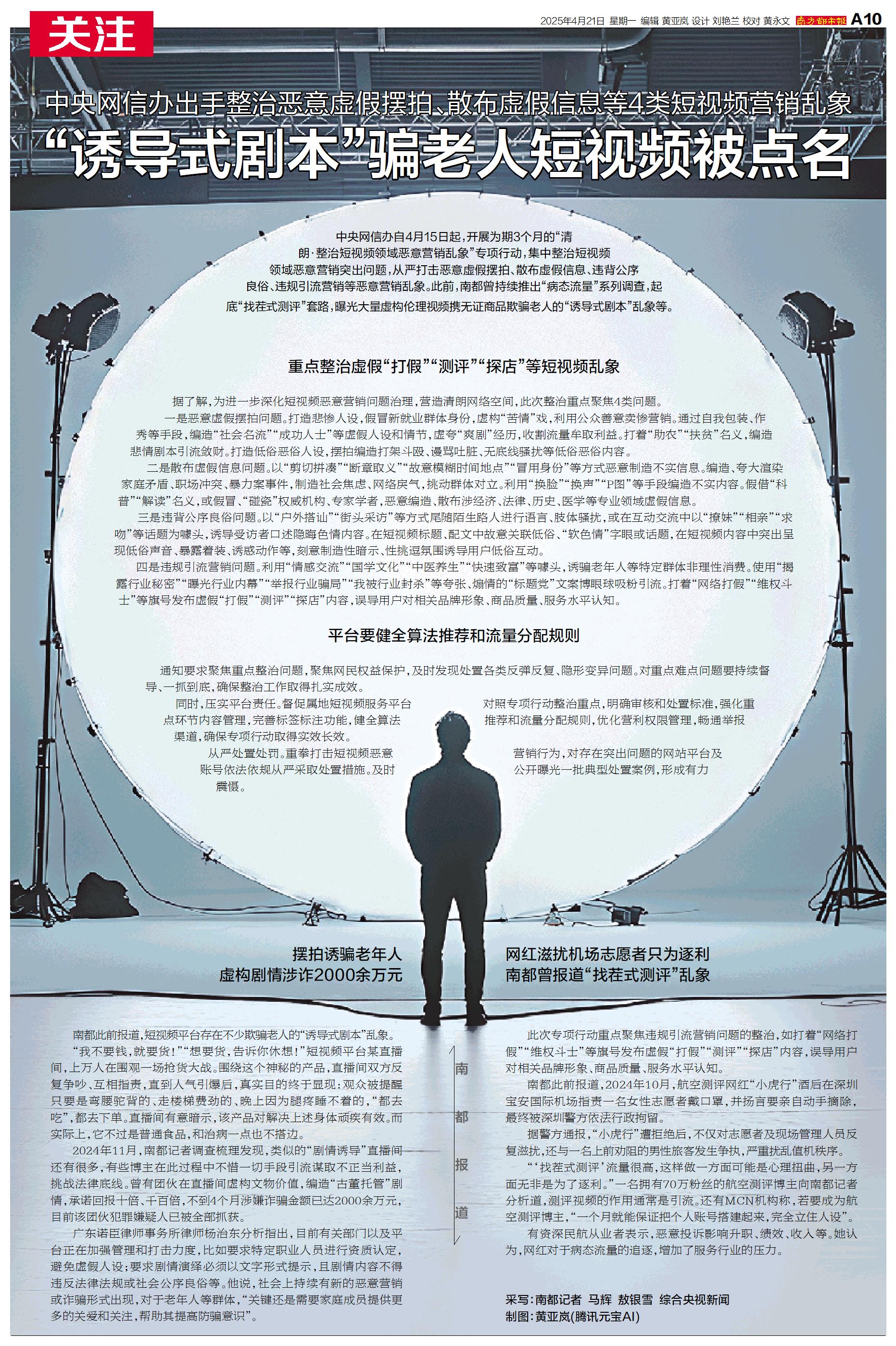 中央网信办自4月15日起,开展为期3个月的“清朗·整治短视频领域恶意营销乱象”专项行动,集中整治短视频领域恶意营销突出问题,从严打击恶意虚假摆拍、散布虚假信息、违背公序良俗、违规引流营销等恶意营销乱象