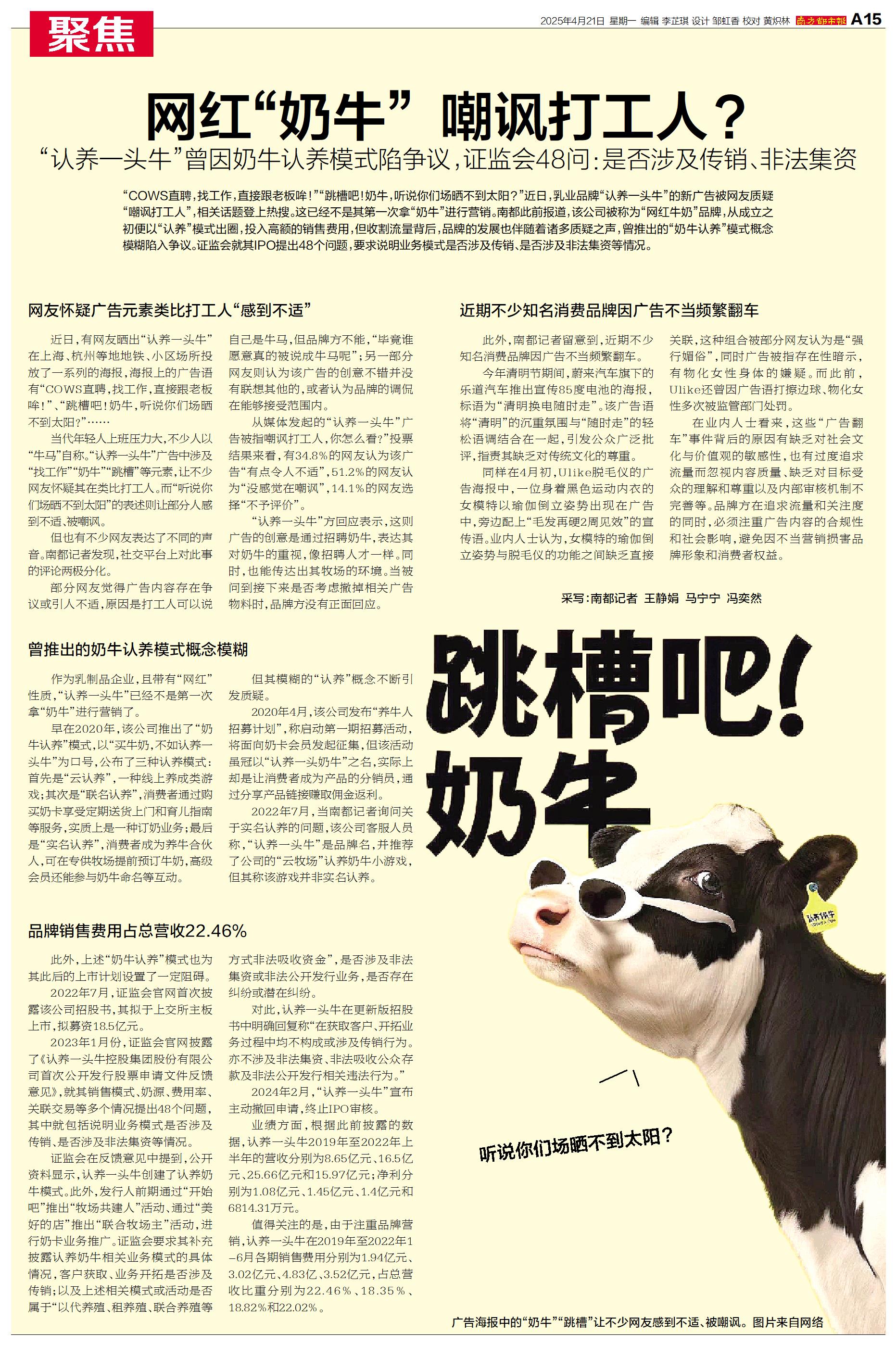 近日,乳业品牌“认养一头牛”的新广告被网友质疑“嘲讽打工人”,相关话题登上热搜。