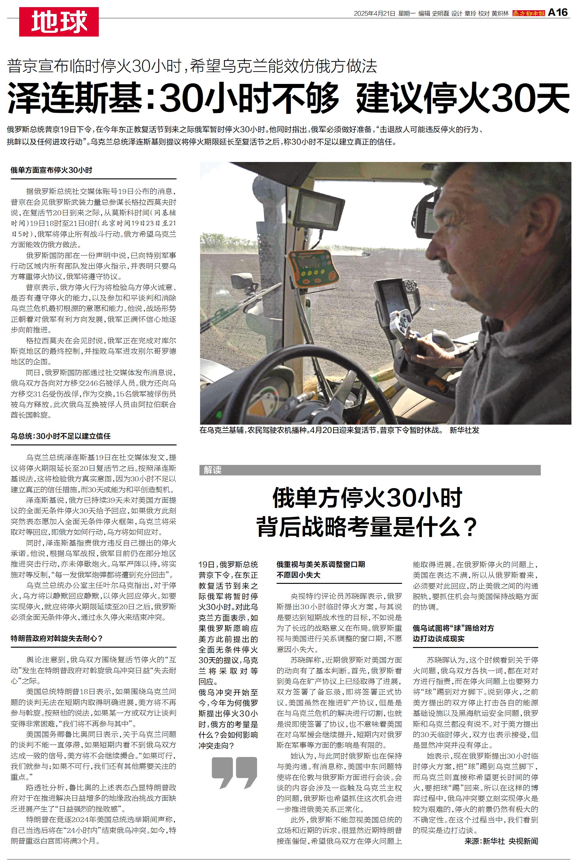 俄罗斯总统普京19日下令,在今年东正教复活节到来之际俄军暂时停火30小时。