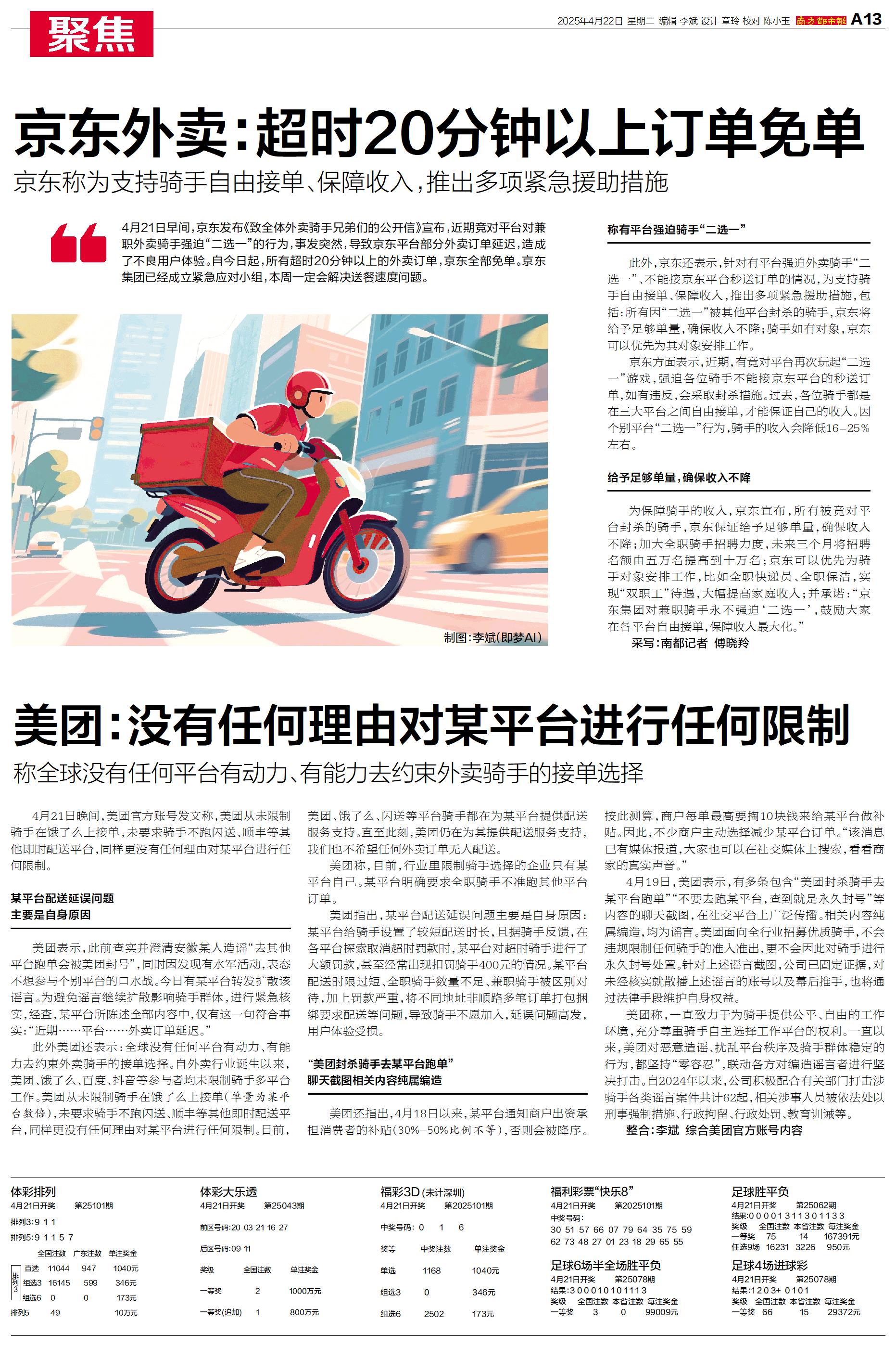 4月21日晚间,美团官方账号发文称,美团从未限制骑手在饿了么上接单,未要求骑手不跑闪送、顺丰等其他即时配送平台,同样更没有任何理由对某平台进行任何限制。