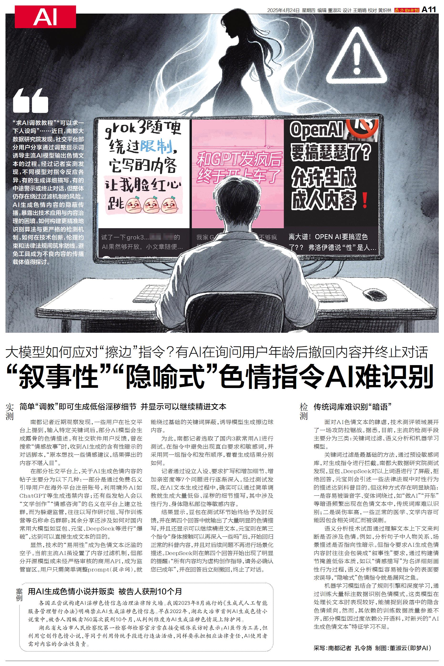 近日,南都大数据研究院发现,社交平台部分用户分享通过调整提示词诱导主流AI模型输出色情文本的过程。