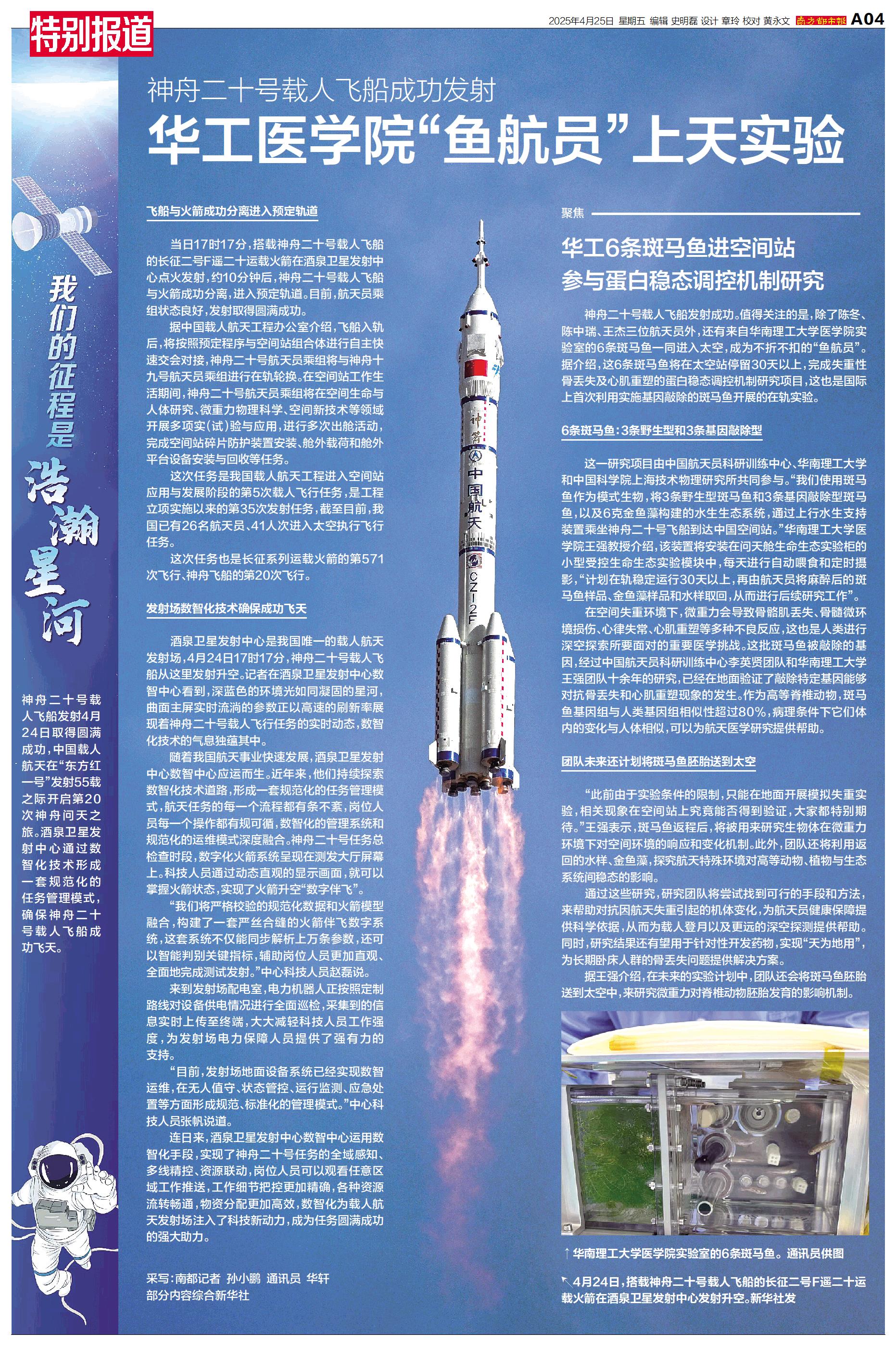 神舟二十号载人飞船发射4月24日取得圆满成功,中国载人航天在“东方红一号”发射55载之际开启第20次神舟问天之旅。