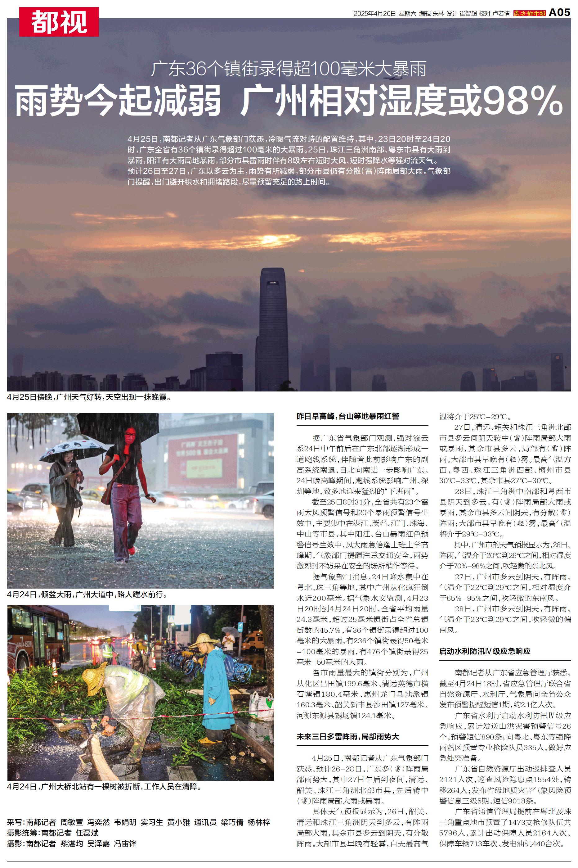 4月25日,南都记者从广东气象部门获悉,冷暖气流对峙的配置维持,其中,23日20时至24日20时,广东全省有36个镇街录得超过100毫米的大暴雨。