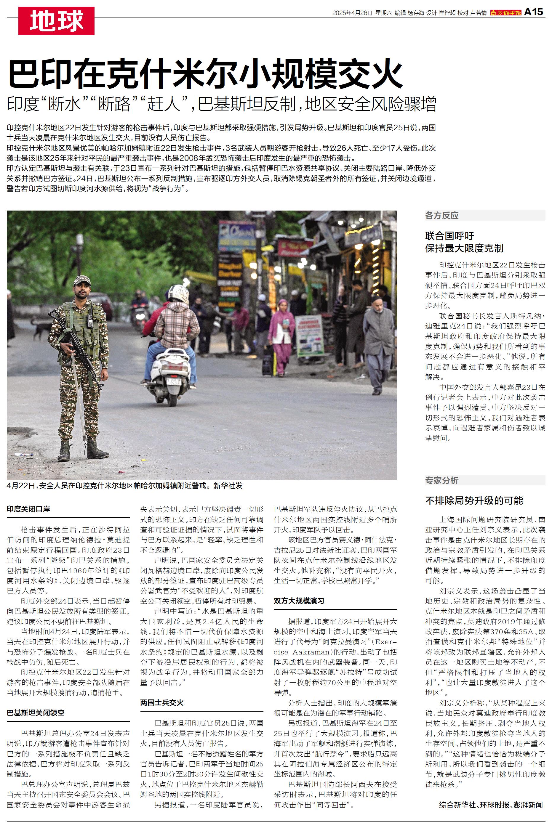 印控克什米尔地区22日发生针对游客的枪击事件后,印度与巴基斯坦都采取强硬措施,引发局势升级。