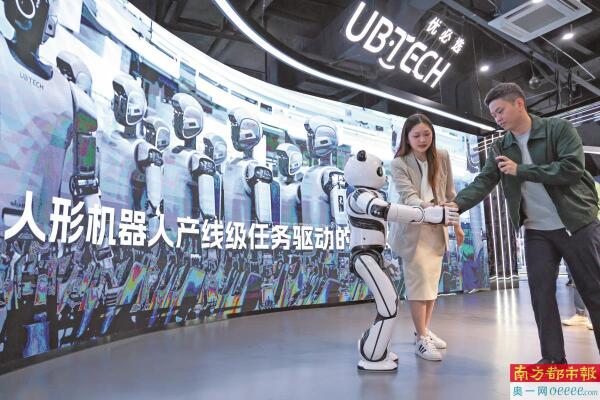 3月26日,在深圳市优必选科技股份有限公司展厅,观众与机器人“优悠”握手。广东正在人工智能和机器人两大领域下大决心、集中发力,努力构筑高技术、高成长、大体量的产业新支柱。 新华社发