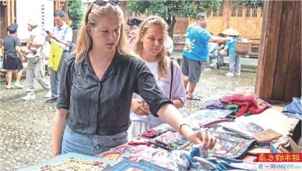 6月27日,外国游客在广西黄洛瑶寨选购纪念品。新华社发