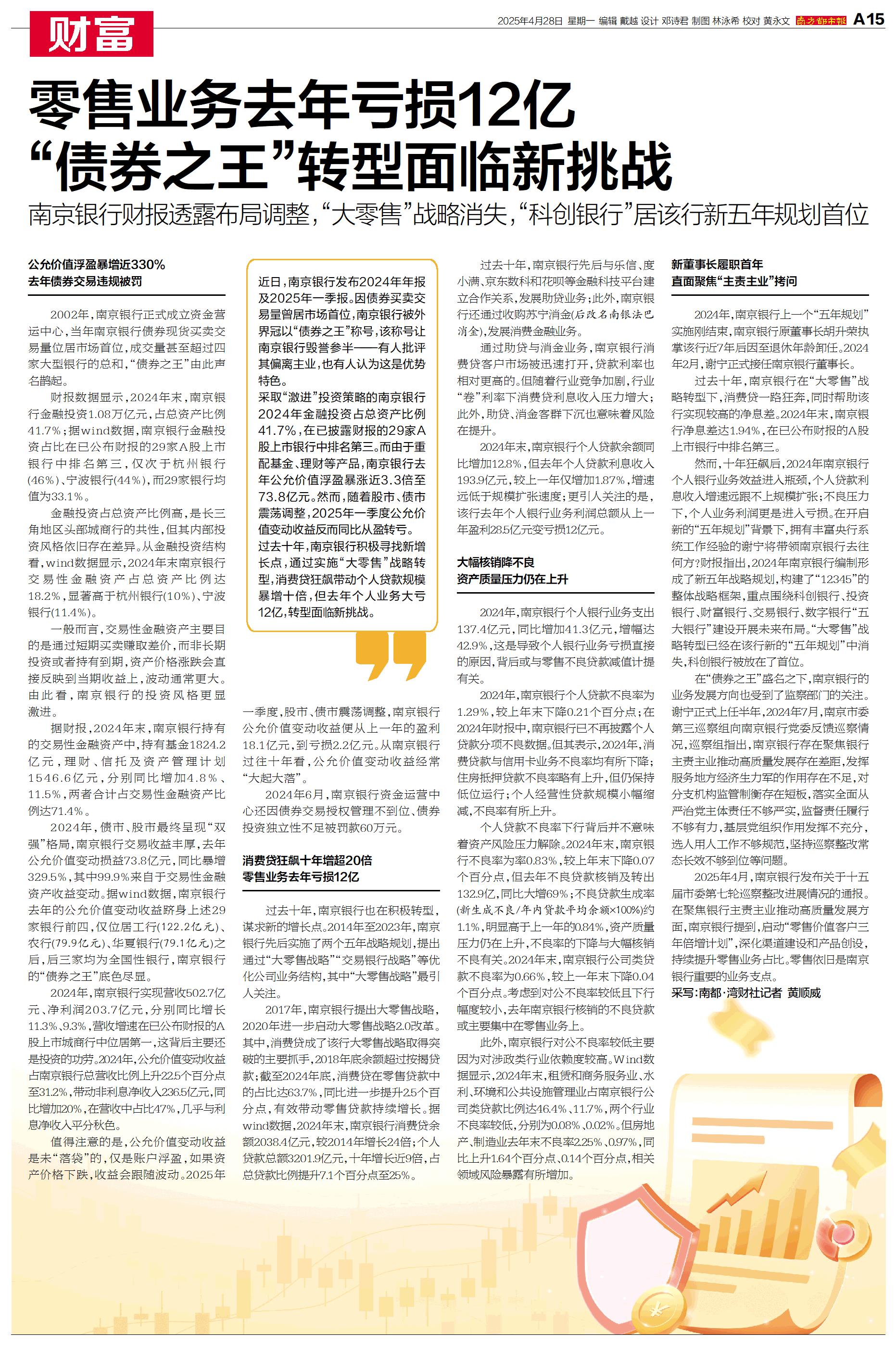 近日,南京银行发布2024年年报及2025年一季报。