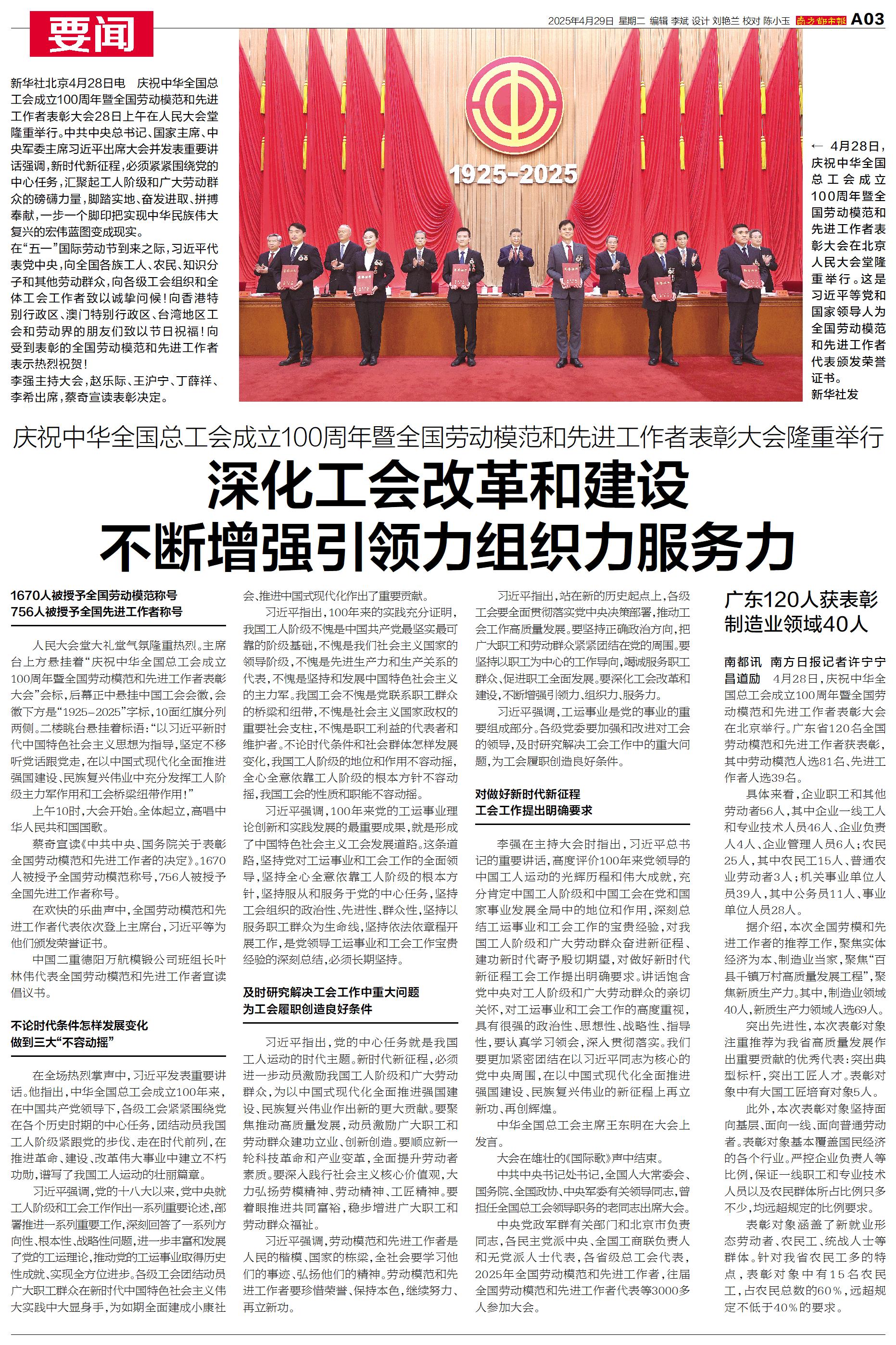 4月28日,庆祝中华全国总工会成立100周年暨全国劳动模范和先进工作者表彰大会在北京举行。