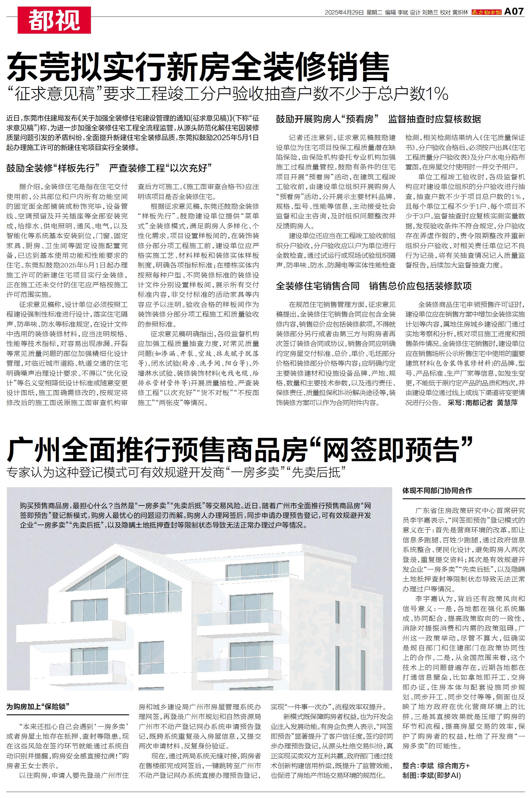 近日,东莞市住建局发布《关于加强全装修住宅建设管理的通知(征求意见稿)》称,为进一步加强全装修住宅工程全流程监管,从源头防范化解住宅因装修质量问题引发的矛盾纠纷,全面提升新建住宅全装修品质,东莞拟鼓励