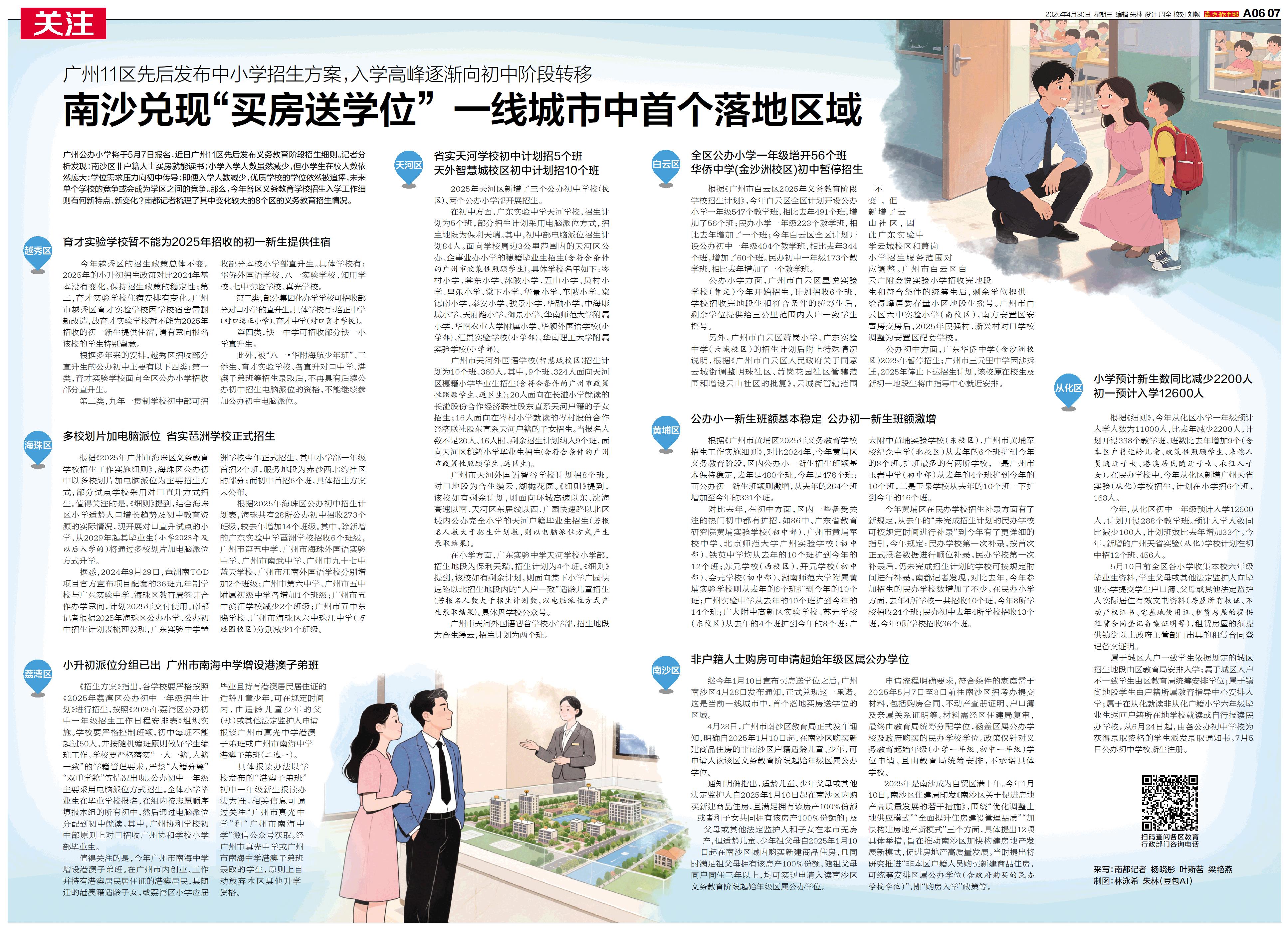 另外,广州市白云区萧岗小学、广东实验中学(云城校区)的招生计划后附上特殊情况说明,根据《广州市白云区人民政府关于同意云城街调整明珠社区、萧岗花园社区管辖范围和增设云山社区的批复》,云城街管辖范围不变,但新增了云山社区,因此广东实验中学云城校区和萧岗小学招生服务范围对应调整。广州市白云区白云广附金悦实验小学招收完地段生和符合条件的统筹生后,剩余学位提供给浔峰居委存量小区地段生摇号。广州市白云区六中实验小学(南校区),南方安置区安置房交房后,2025年民强村、新兴村对口学校调整为安置区配套学校。