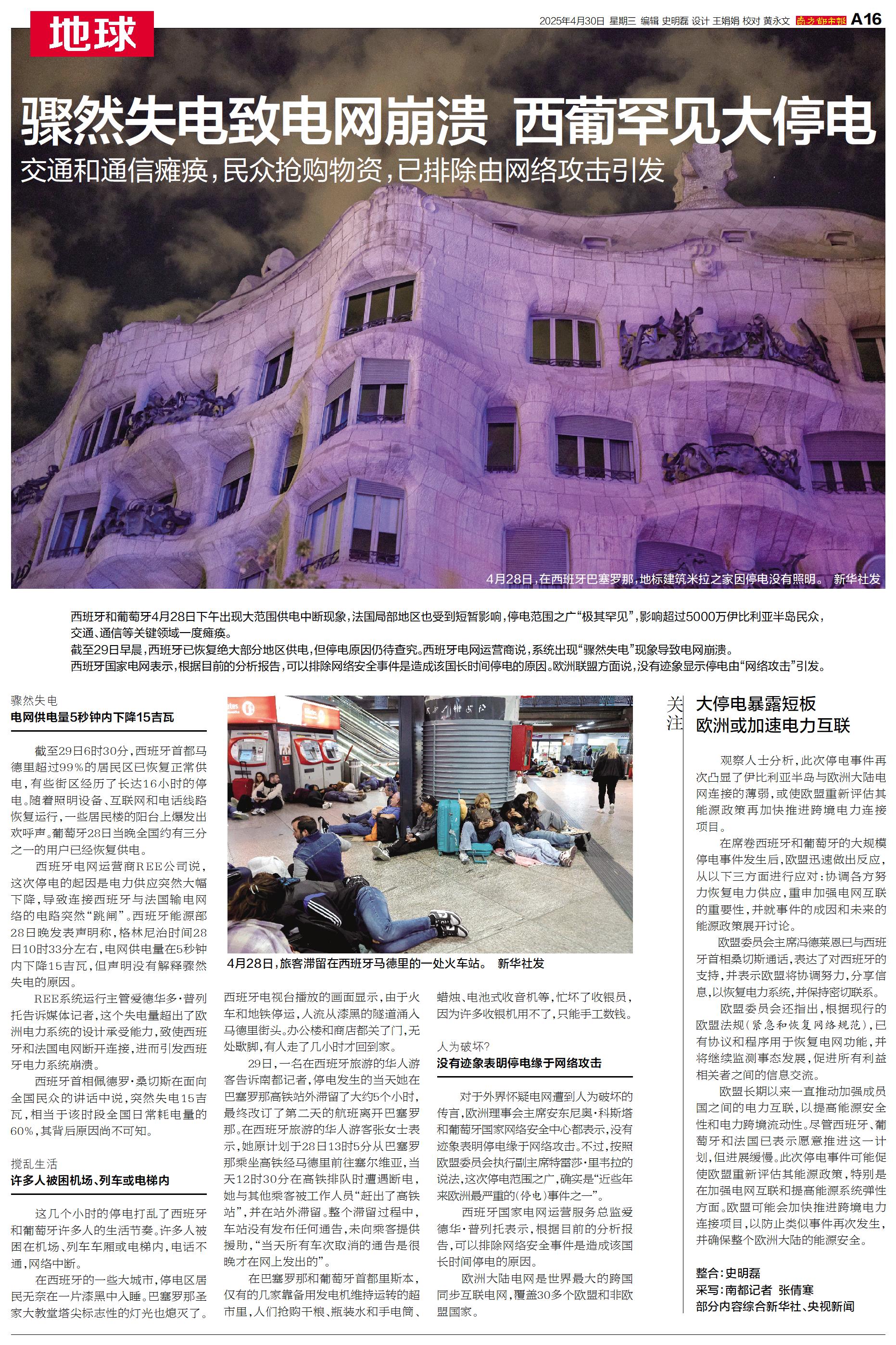 西班牙和葡萄牙4月28日下午出现大范围供电中断现象,法国局部地区也受到短暂影响,停电范围之广“极其罕见”,影响超过5000万伊比利亚半岛民众,交通、通信等关键领域一度瘫痪。