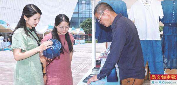 在“巧匠”展区,身着旗袍的“小姐姐”们,在河源墩头蓝纺织技艺展示区里流连忘返。技艺传承人曾春雷向客人展示用墩头蓝制作的“时尚单品”。