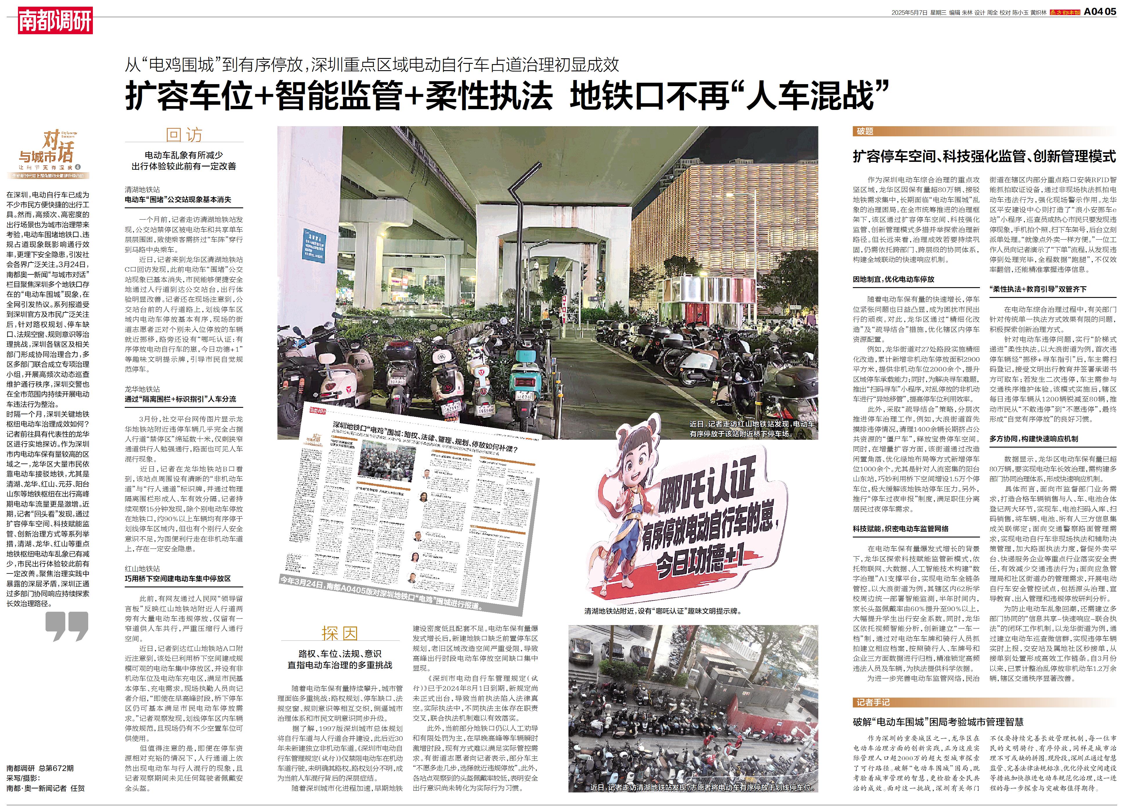 作为深圳的重要城区之一,龙华区在电动车治理方面的创新实践,正为这座实际管理人口超2000万的超大型城市探索了可行路径。破解“电动车围城”困局,既考验着城市管理的智慧,更检验着全民共治的成效。面对这一挑战,深圳有关部门不仅要持续完善长效管理机制,每一位市民的文明骑行、有序停放,同样是城市治理不可或缺的拼图。现阶段,深圳正通过智慧监管、完善法律法规标准、优化停放空间建设等措施加快推进电动车规范化治理,这一进程的每一步探索与突破都值得期待。