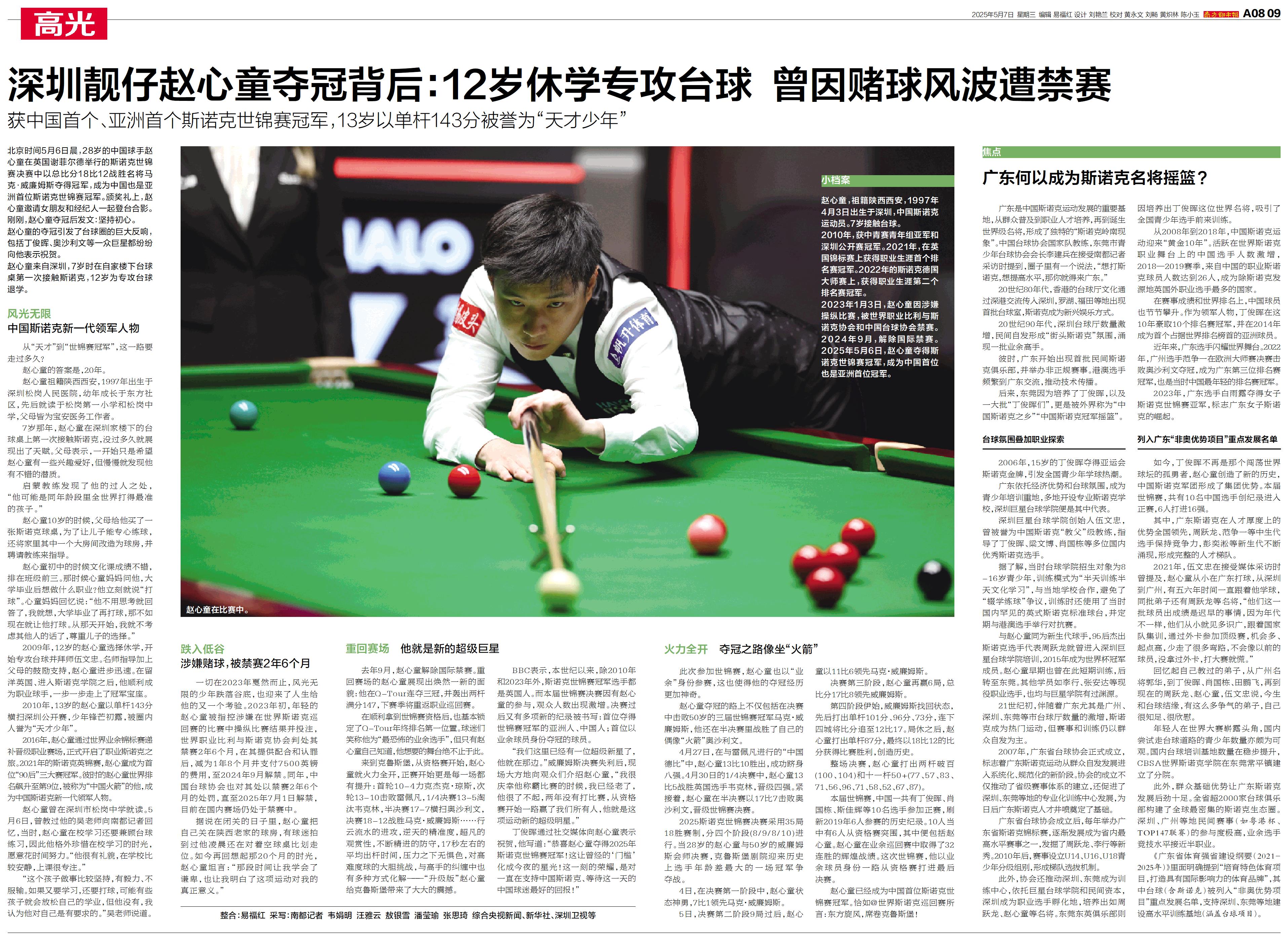 赵心童来自深圳,7岁时在自家楼下台球桌第一次接触斯诺克,12岁为专攻台球退学。