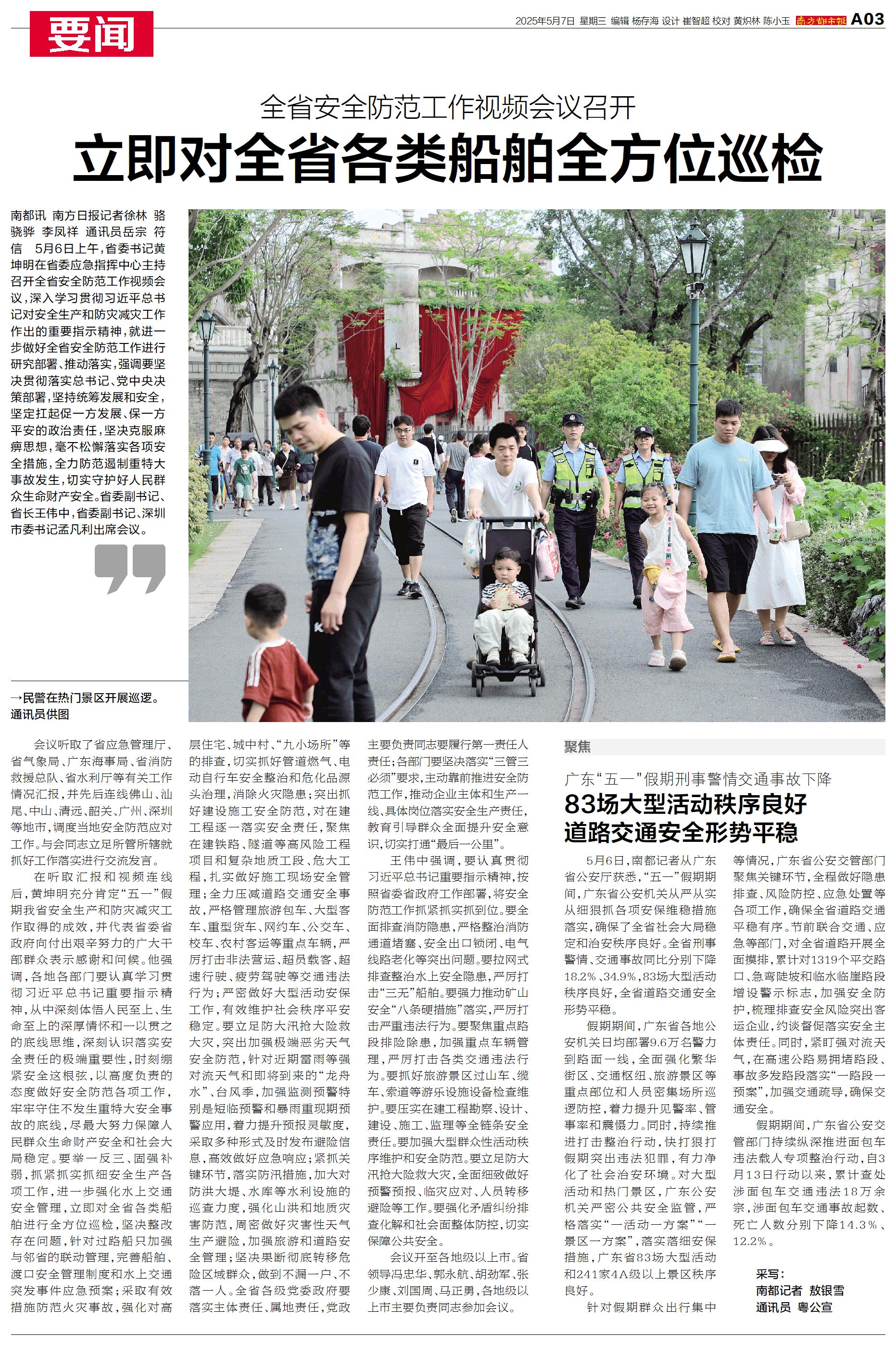 5月6日,南都记者从广东省公安厅获悉,“五一”假期期间,广东省公安机关从严从实从细狠抓各项安保维稳措施落实,确保了全省社会大局稳定和治安秩序良好。