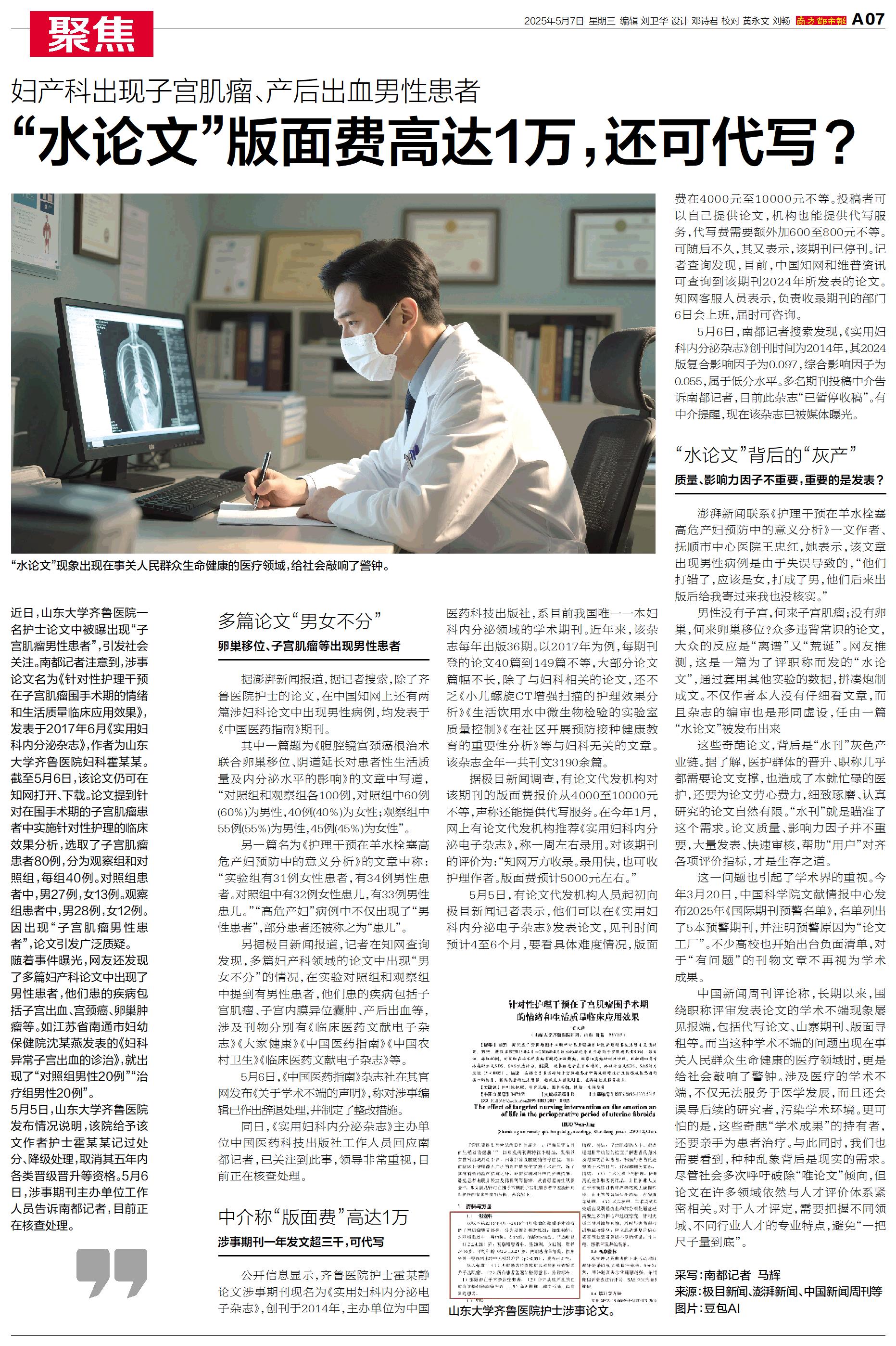近日,山东大学齐鲁医院一名护士论文中被曝出现“子宫肌瘤男性患者”,引发社会关注。
