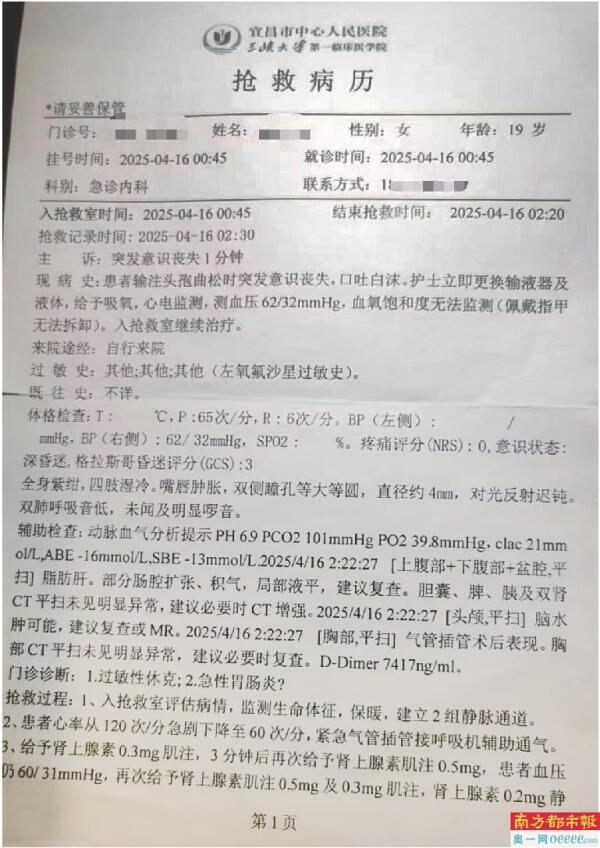 5月6日,小雯的家属向南都记者讲述了事发过程。4月15日22时57分左右,小雯因腹痛呕吐前往宜昌市中心人民医院西陵院区急诊内科就诊,三位同学陪伴同行。家属称,小雯正在读大一,平时身体很好,事发当天还曾跟奶奶聊天,“说找奶奶报销200元买鞋子的钱”。
