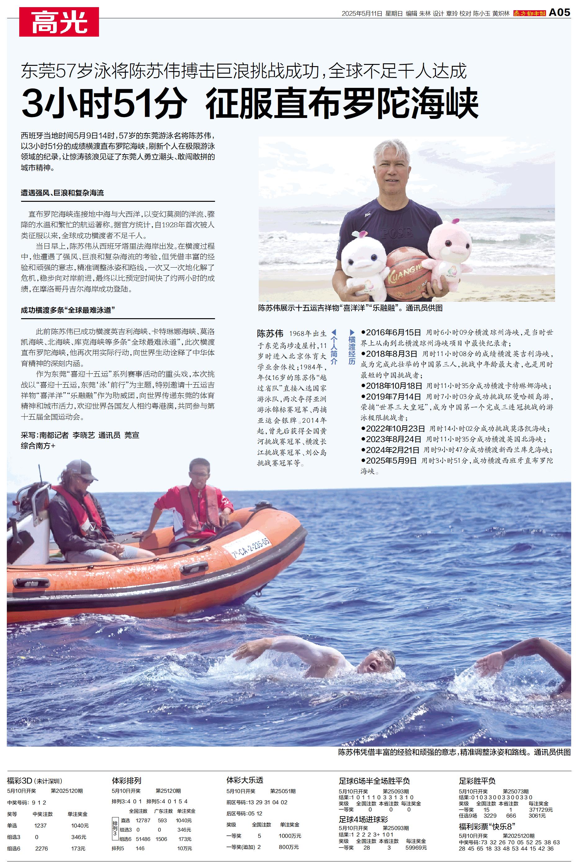 西班牙当地时间5月9日14时,57岁的东莞游泳名将陈苏伟,以3小时51分的成绩横渡直布罗陀海峡,刷新个人在极限游泳领域的纪录,让惊涛骇浪见证了东莞人勇立潮头、敢闯敢拼的城市精神。