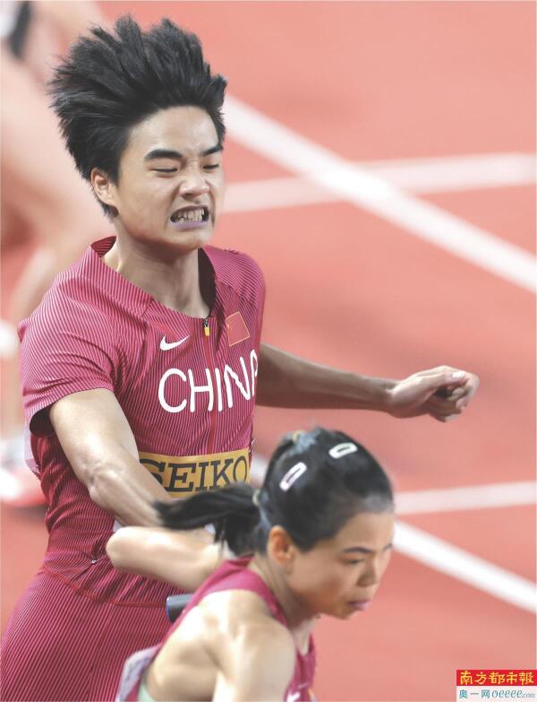 广州天河体育中心,2025年世界田联接力赛混合4×400米接力第二轮资格赛,中国队第一棒选手梁宝棠(上)和第二棒选手莫家蝶在比赛中交接棒。 南都记者 徐杰 汪雅云 张志韬 摄影报道