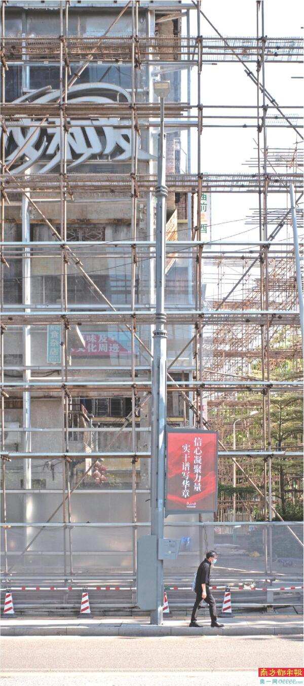 5月12日下午,南都、N视频记者在天河区华文街原“广州文和友”建筑外看到,建筑物范围被脚手架包围,施工工人正在脚手架内作业。原“广州文和友”的主标识和玻璃幕墙仍未被卸下。