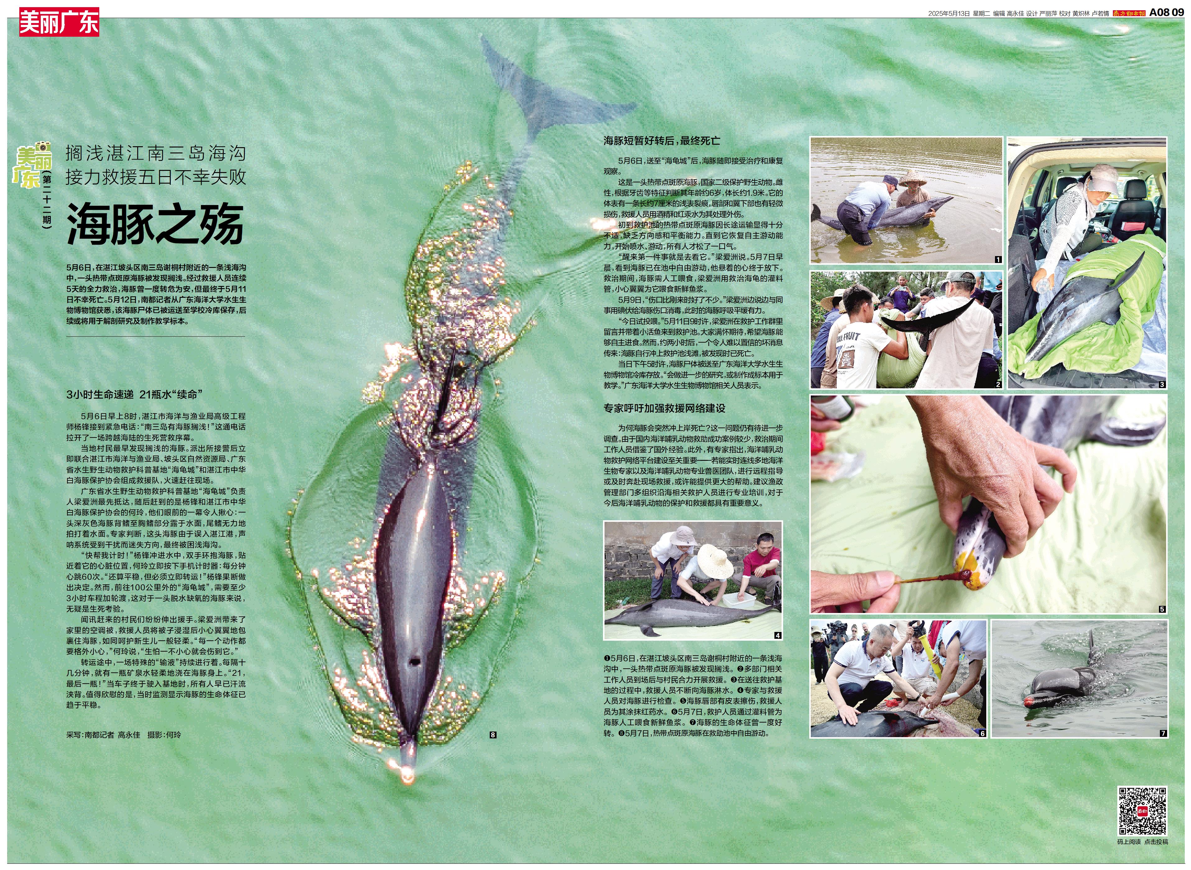 5月6日,在湛江坡头区南三岛谢桐村附近的一条浅海沟中,一头热带点斑原海豚被发现搁浅。