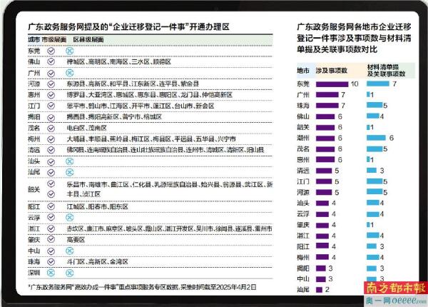 南都大数据研究院梳理发现,广东政务服务网上各地市提供的“企业迁移登记一件事”办事指南,包括申请材料、关联事项等,也与实际情况存在差异。