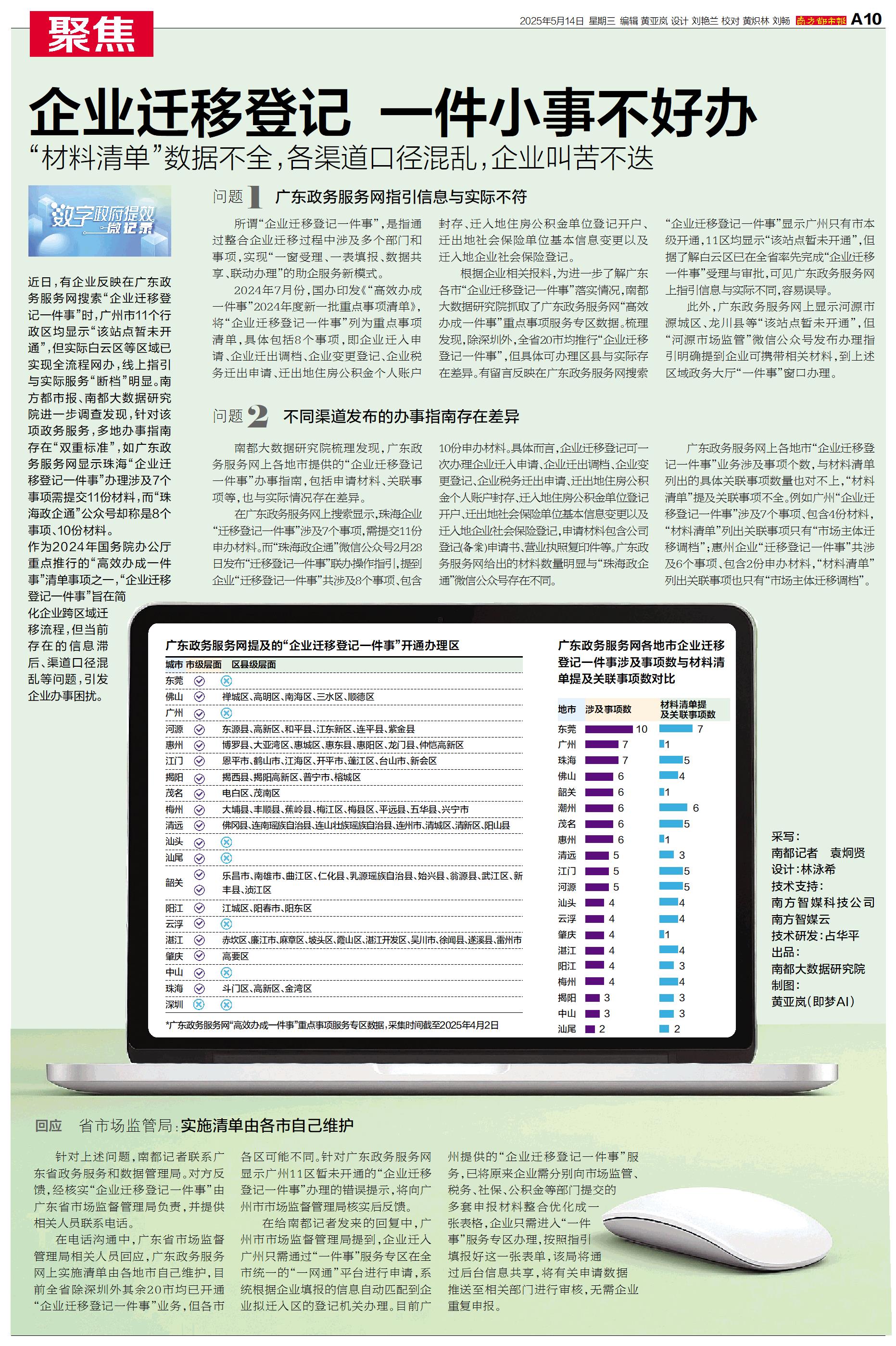 近日,有企业反映在广东政务服务网搜索“企业迁移登记一件事”时,广州市11个行政区均显示“该站点暂未开通”,但实际白云区等区域已实现全流程网办,线上指引与实际服务“断档”明显。