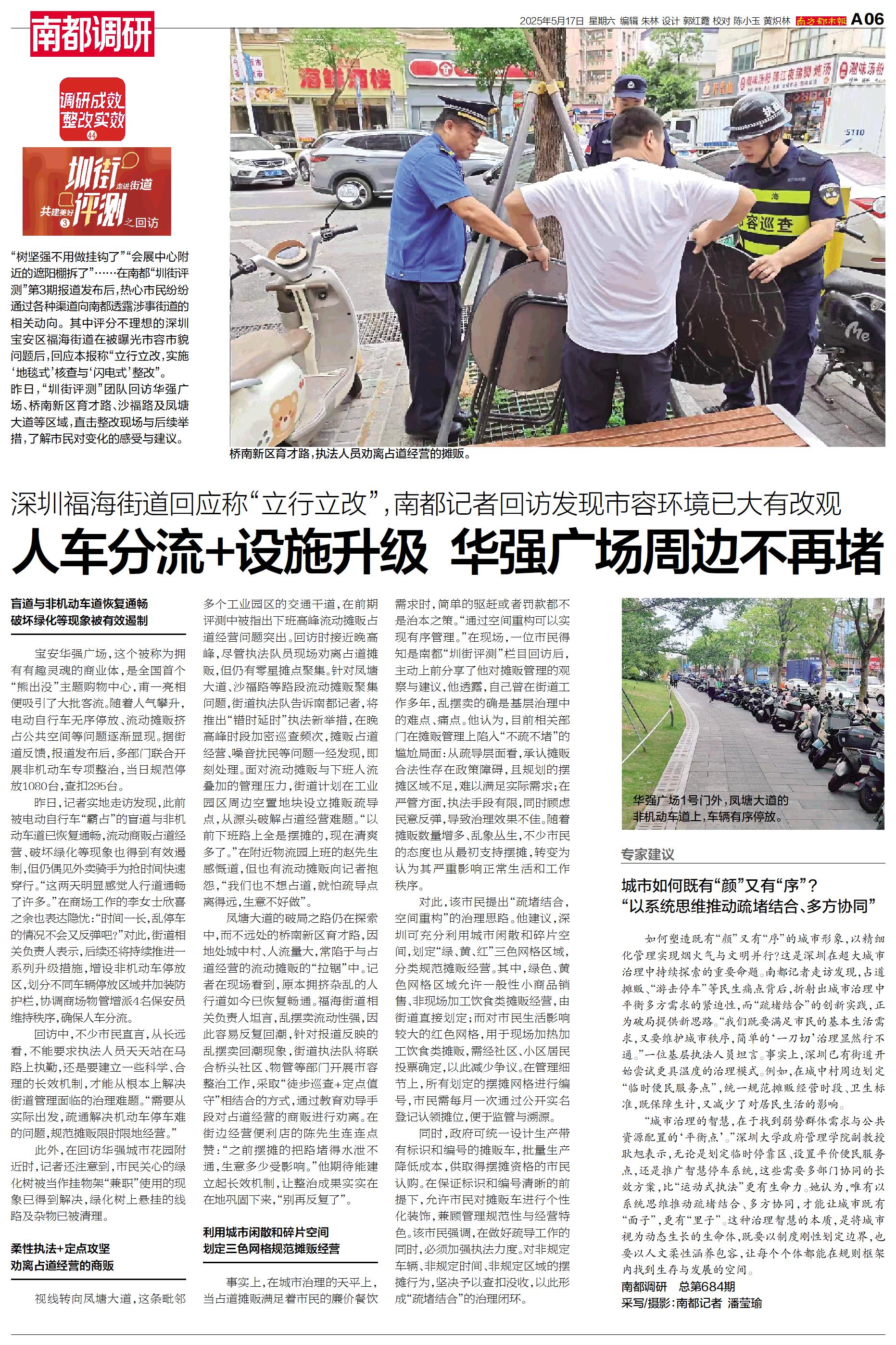 凤塘大道的破局之路仍在探索中,而不远处的桥南新区育才路,因地处城中村、人流量大,常陷于与占道经营的流动摊贩的“拉锯”中。记者在现场看到,原本拥挤杂乱的人行道如今已恢复畅通。福海街道相关负责人坦言,乱摆卖流动性强,因此容易反复回潮,针对报道反映的乱摆卖回潮现象,街道执法队将联合桥头社区、物管等部门开展市容整治工作,采取“徒步巡查+定点值守”相结合的方式,通过教育劝导手段对占道经营的商贩进行劝离。在街边经营便利店的陈先生连连点赞:“之前摆摊的把路堵得水泄不通,生意多少受影响。”他期待能建立起长效机制,让整治成果实实在在地巩固下来,“别再反复了”。