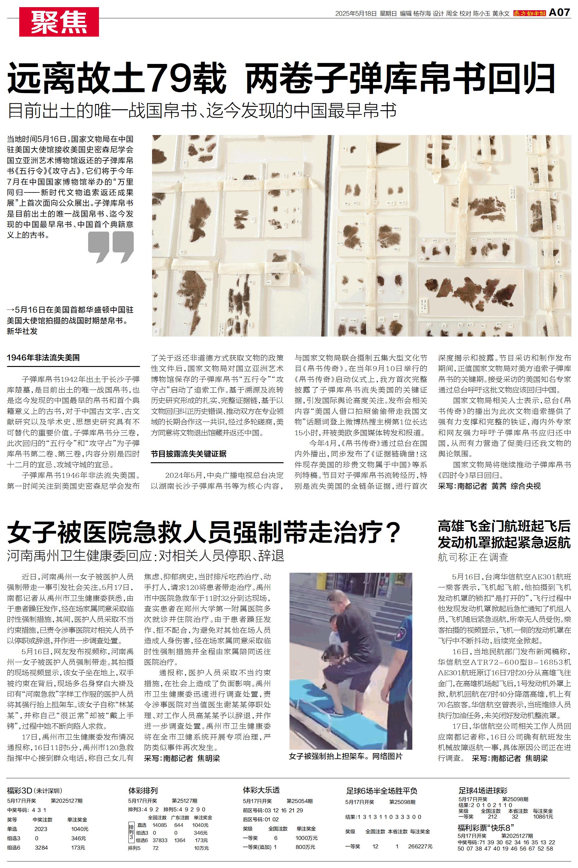 当地时间5月16日,国家文物局在中国驻美国大使馆接收美国史密森尼学会国立亚洲艺术博物馆返还的子弹库帛书《五行令》《攻守占》,它们将于今年7月在中国国家博物馆举办的“万里同归——新时代文物追索返还成果展