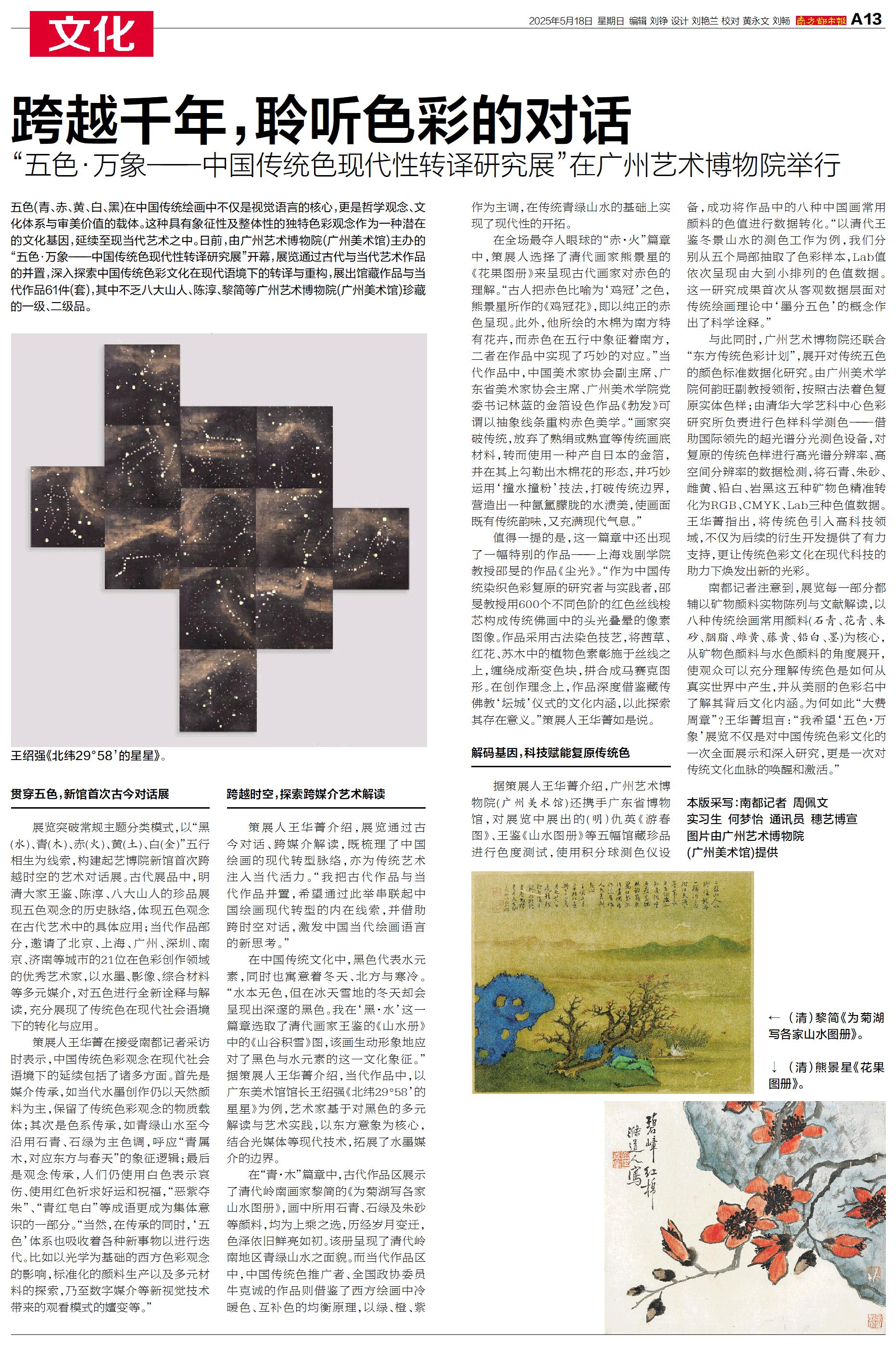 日前,中国传统色现代性转译研究展”开幕,展览通过古代与当代艺术作品的并置,深入探索中国传统色彩文化在现代语境下的转译与重构,展出馆藏作品与当代作品61件(套),其中不乏八大山人、陈淳、黎简等广州艺术博
