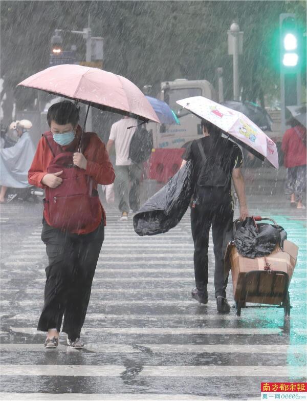广州暴雨,路人打伞行色匆匆。 南都记者 梁炜培 冯宙锋 张志韬 摄