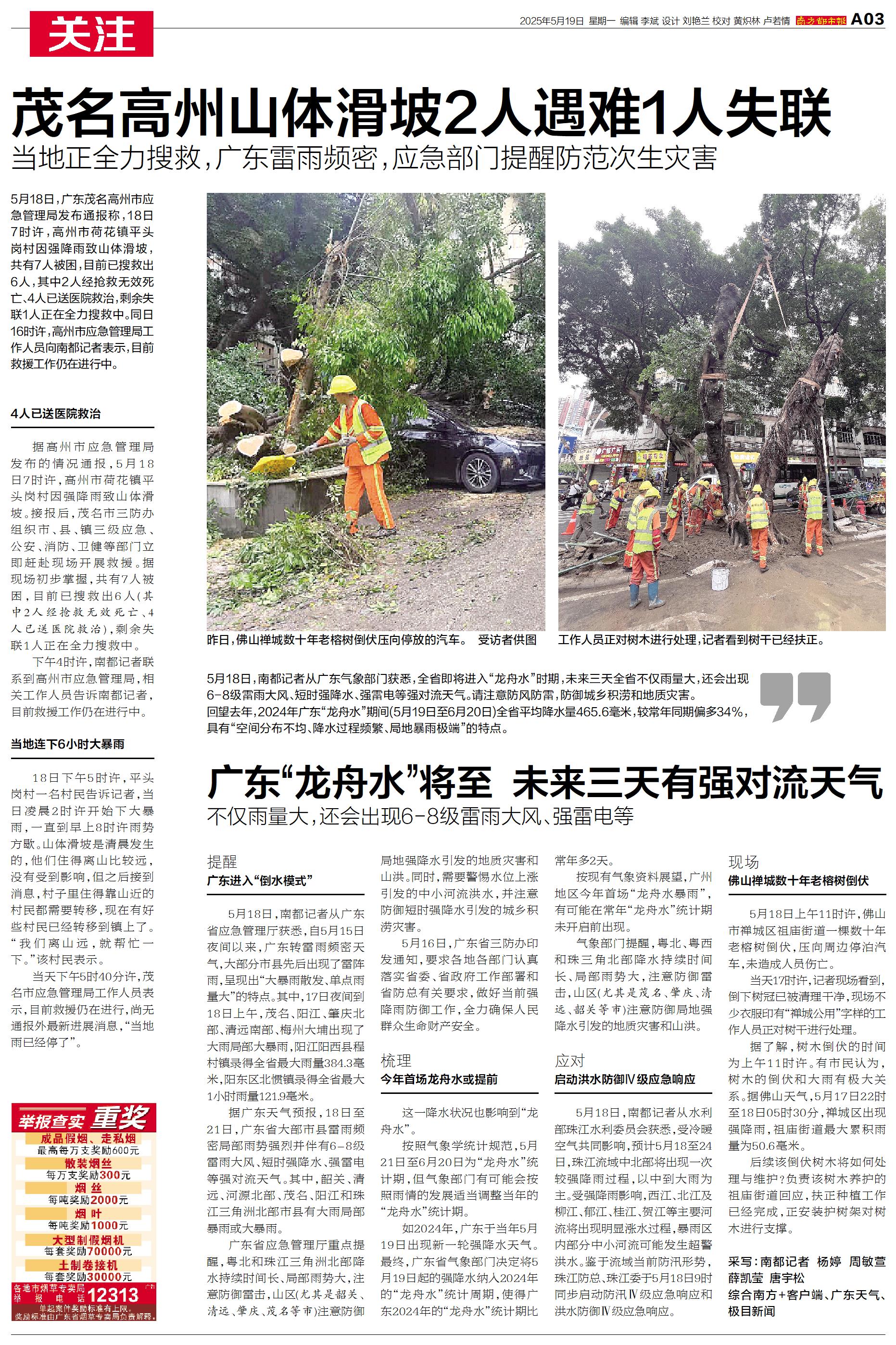 5月18日,南都记者从广东气象部门获悉,全省即将进入“龙舟水”时期,未来三天全省不仅雨量大,还会出现6-8级雷雨大风、短时强降水、强雷电等强对流天气。