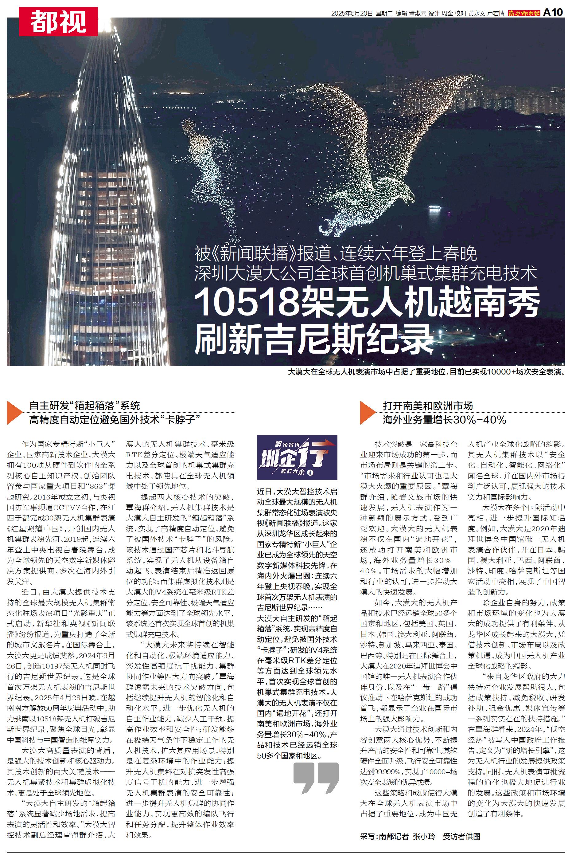 近日,大漠大智控技术启动全球最大规模的无人机集群常态化驻场表演被央视《新闻联播》报道。