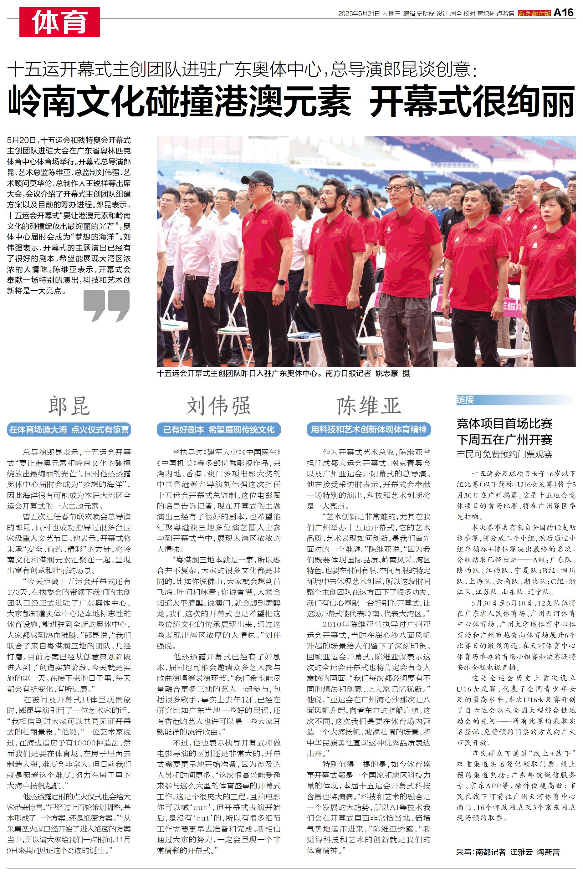 “艺术创新是非常难的,尤其在我们广州举办十五运开幕式,它的艺术品质、艺术表现如何创新,是我们首先面对的一个难题。”陈维亚说,“因为我们既要体现国际品质、岭南风采、湾区特色,也要在时间有限、空间有限的特定环境中去体现艺术创意,所以这段时间整个主创团队在这方面下了很多功夫,我们有信心奉献一台特别的开幕式,让这场开幕式能代表岭南、代表大湾区。”