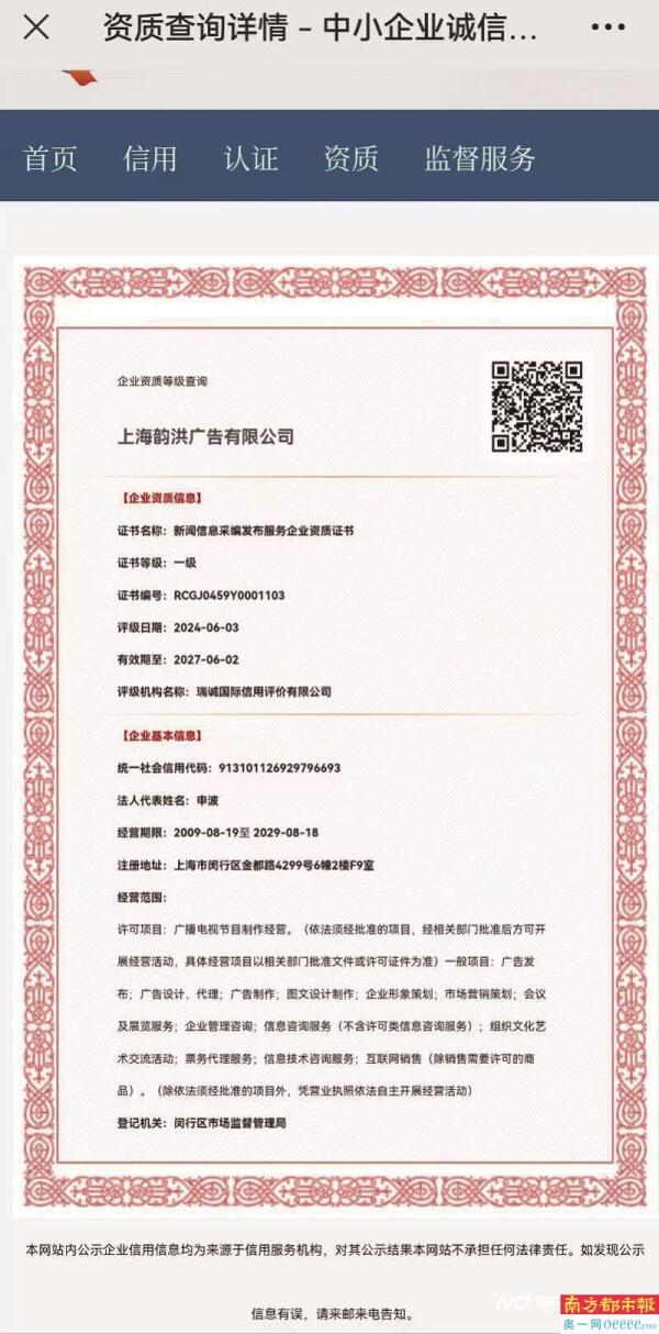 为了进一步验证互联网“新闻信息采编发布服务企业资质”的含金量,记者尝试从网上多方搜索查证该资质的来源。在中小企业诚信服务平台上,通过资质查询入口搜索“上海韵洪广告有限公司”,得到了一份由瑞诚国际信用评价有限公司评定的“新闻信息采编发布服务企业资质证书”。