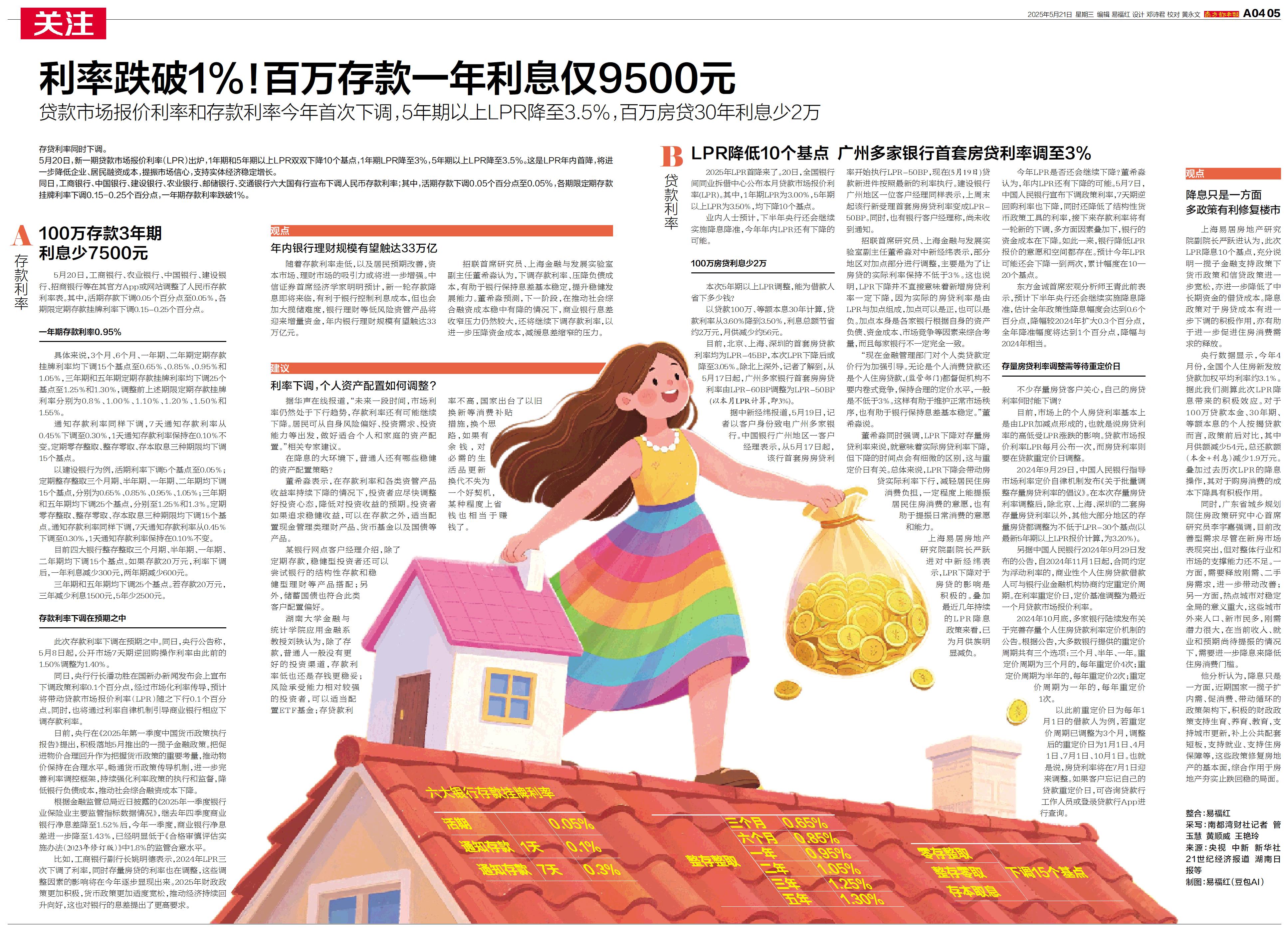 目前,北京、上海、深圳的首套房贷款利率均为LPR-45BP,本次LPR下降后或降至3.05%。除北上深外,记者了解到,从5月17日起,广州多家银行首套房房贷利率由LPR-60BP调整为LPR-50BP(以本月LPR计算,即3%)。