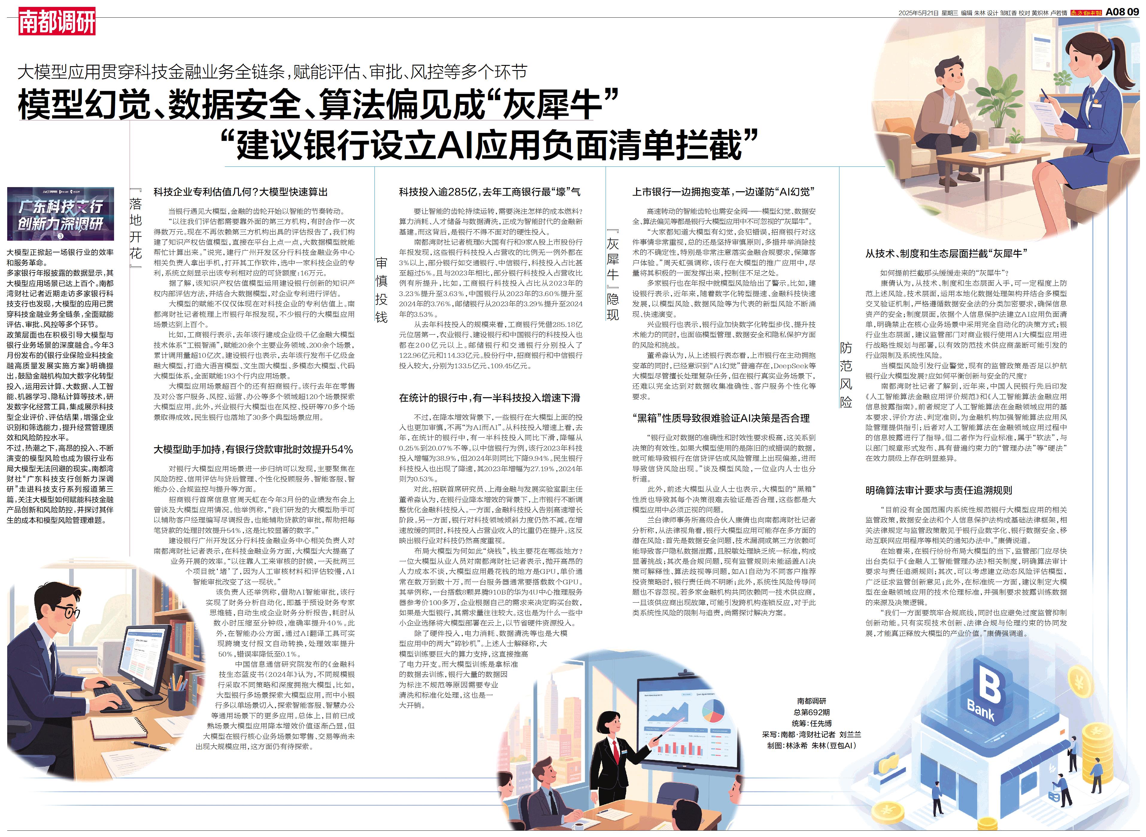 不过,热潮之下,高昂的投入、不断演变的模型风险也成为银行业布局大模型无法回避的现实。南都湾财社“广东科技支行创新力深调研”走进科技支行系列报道第三篇,关注大模型如何赋能科技金融产品创新和风险防控,并探讨其伴生的成本和模型风险管理难题。