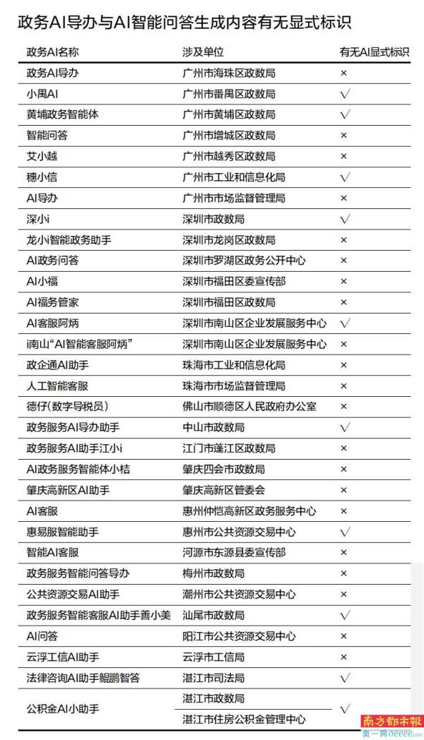 在AI生成内容强制标识的背景下,南都大数据研究院根据媒体报道信息,全网检索梳理了广东省内面对公众服务的政务AI导办、AI智能问答共31个。观测发现,仅10个政务AI导办或AI智能问答生成内容的交互界面,明确标注“由人工智能生成”“由AI生成”等文字提示,其他无显式标识或将文字提示隐藏在免责声明中。