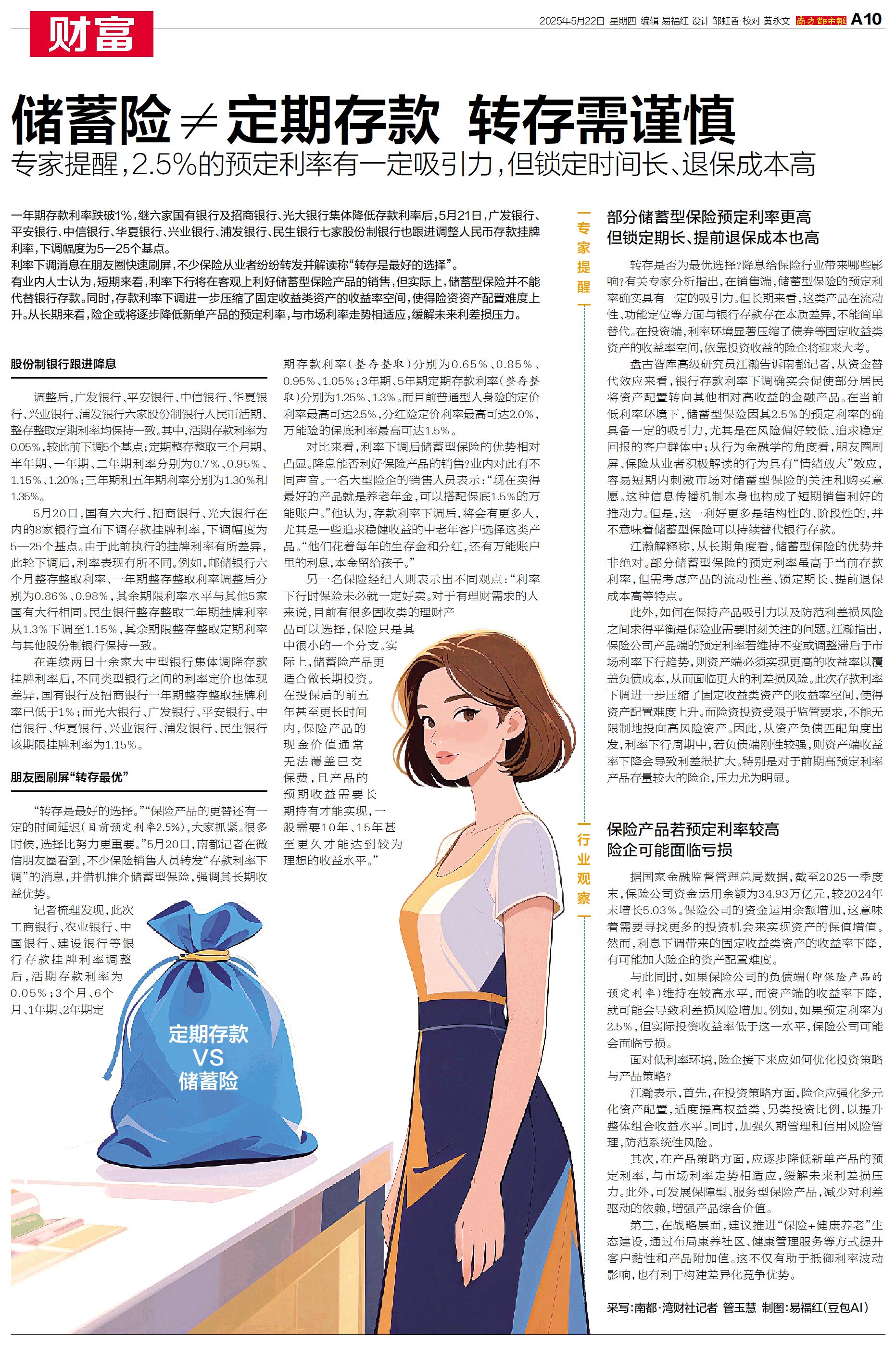 盘古智库高级研究员江瀚告诉南都记者,从资金替代效应来看,银行存款利率下调确实会促使部分居民将资产配置转向其他相对高收益的金融产品。在当前低利率环境下,储蓄型保险因其2.5%的预定利率的确具备一定的吸引力,尤其是在风险偏好较低、追求稳定回报的客户群体中;从行为金融学的角度看,朋友圈刷屏、保险从业者积极解读的行为具有“情绪放大”效应,容易短期内刺激市场对储蓄型保险的关注和购买意愿。这种信息传播机制本身也构成了短期销售利好的推动力。但是,这一利好更多是结构性的、阶段性的,并不意味着储蓄型保险可以持续替代银行存款。