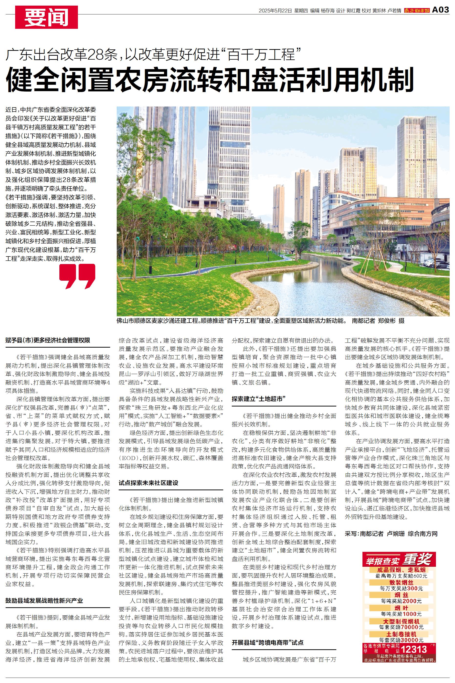 近日,中共广东省委全面深化改革委员会印发《关于以改革更好促进“百县千镇万村高质量发展工程”的若干措施》。
