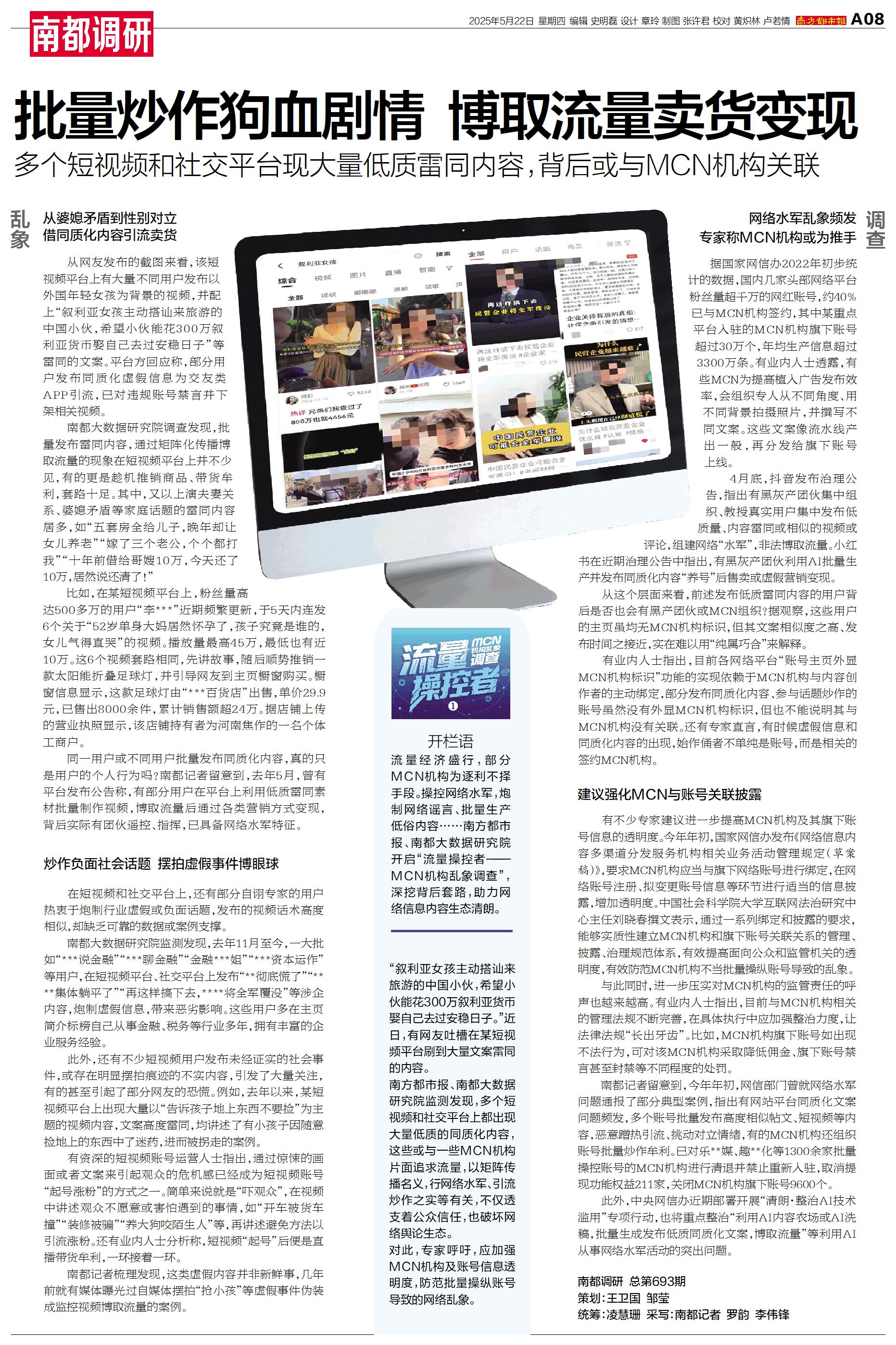 南方都市报、南都大数据研究院开启“流量操控者——MCN机构乱象调查”,深挖背后套路,助力网络信息内容生态清朗。