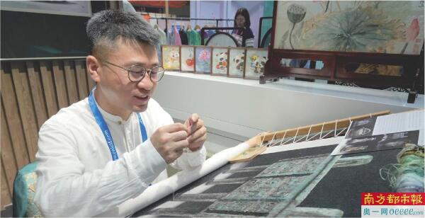 5月22日,文博会在国际会展中心开幕,苏绣非遗代表性传承人付健现场演示青铜器针绣。