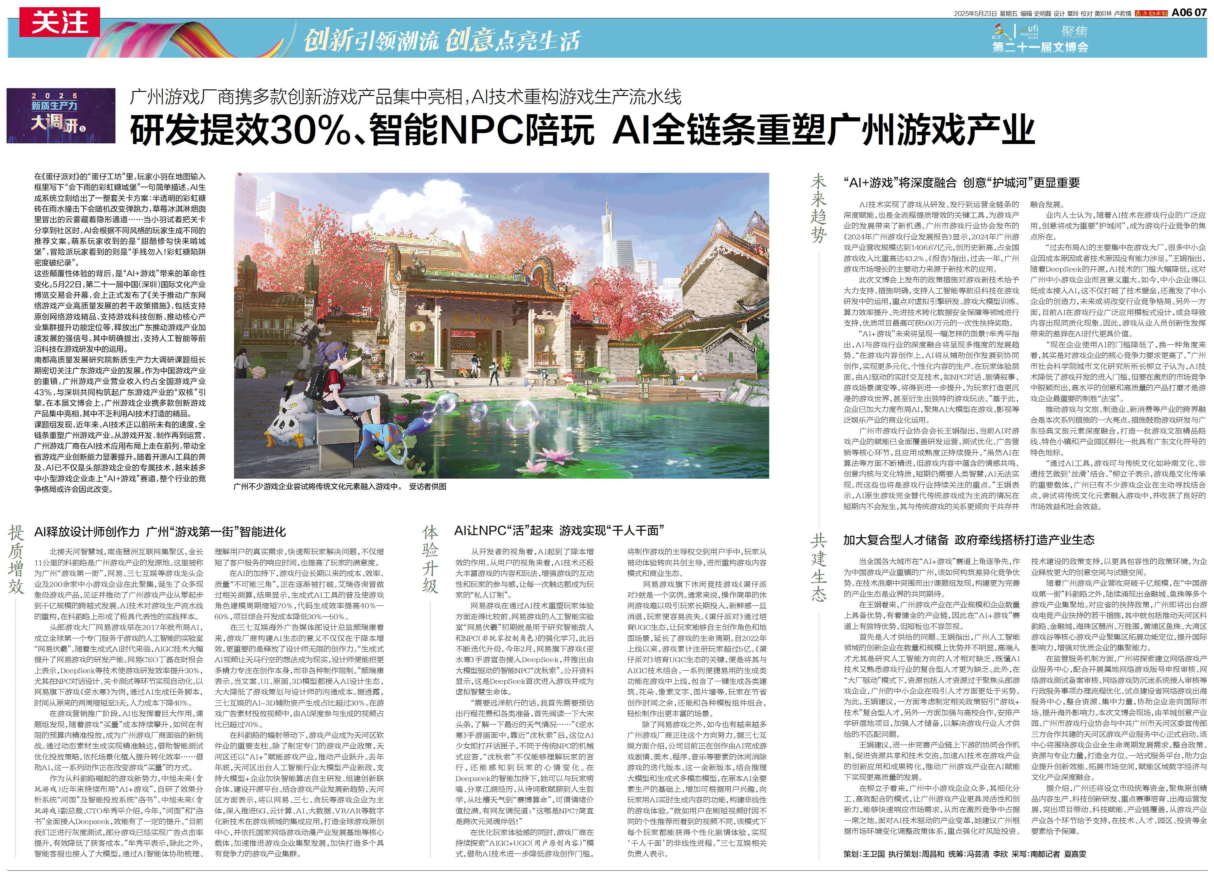 研发提效30%、智能NPC陪玩 AI全链条重塑广州游戏产业