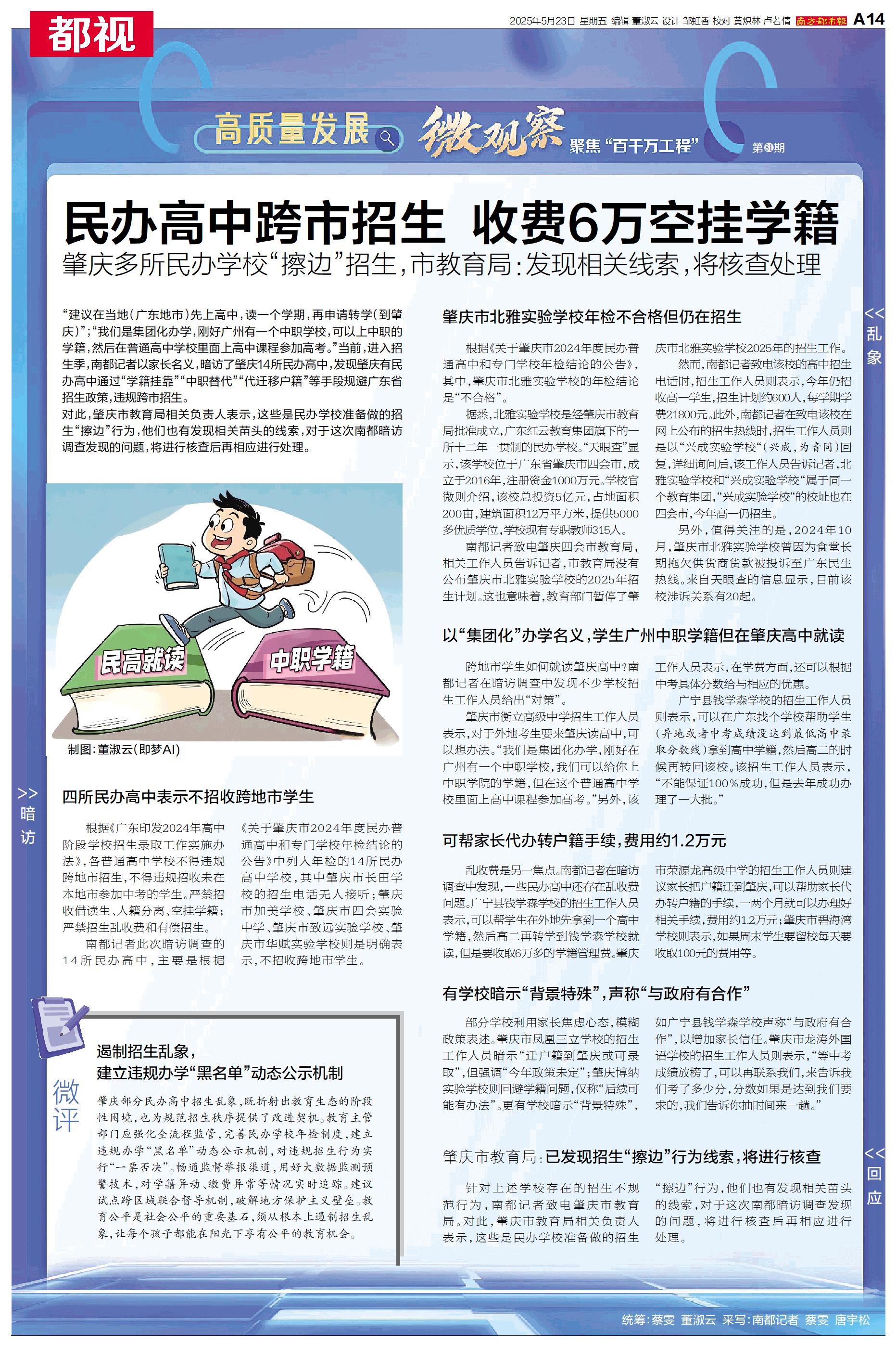 当前,进入招生季,南都记者以家长名义,暗访了肇庆14所民办高中,发现肇庆有民办高中通过“学籍挂靠”“中职替代”“代迁移户籍”等手段规避广东省招生政策,违规跨市招生。