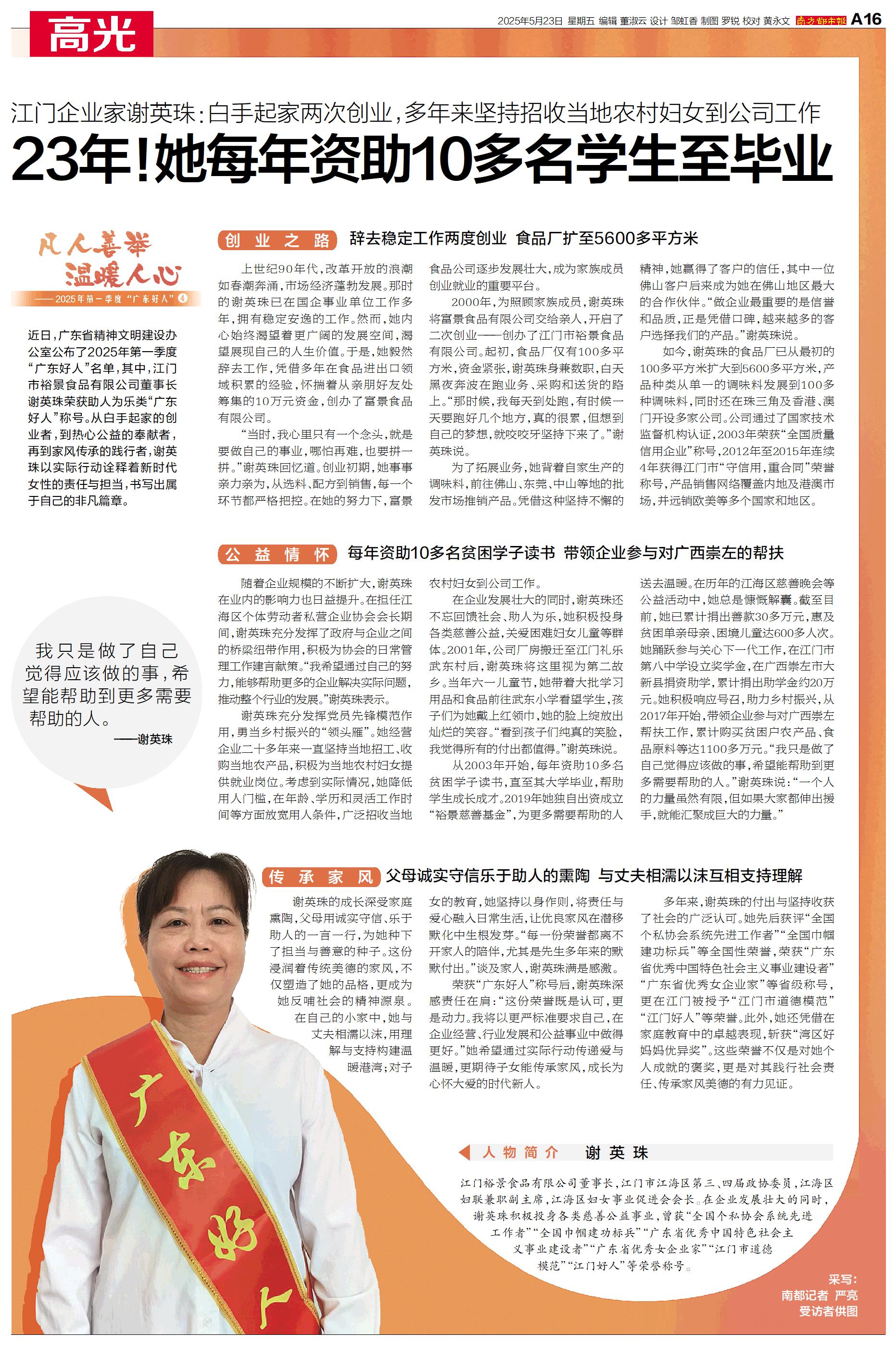 近日,广东省精神文明建设办公室公布了2025年第一季度“广东好人”名单,其中,江门市裕景食品有限公司董事长谢英珠荣获助人为乐类“广东好人”称号。